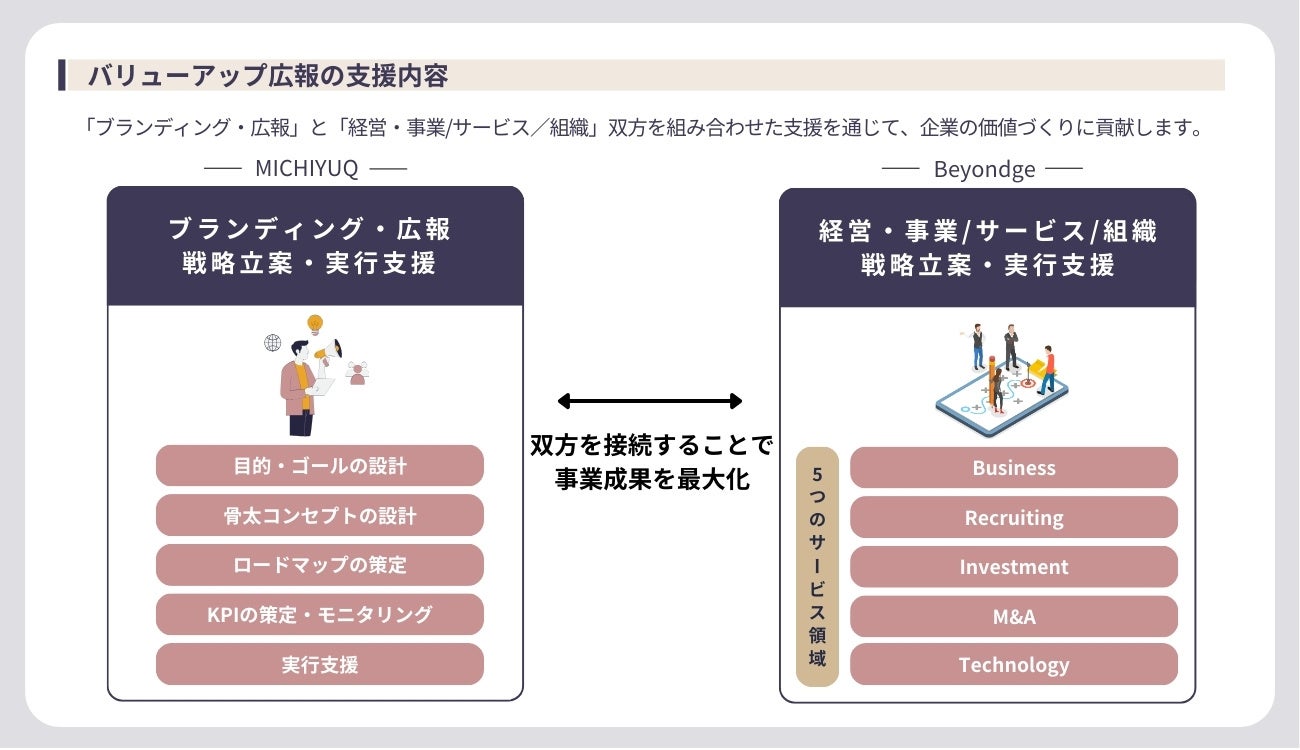 株式会社MICHIYUQ(本社:東京都新宿区、代表取締役:丸山悠未、以下MICHIYUQ)は、スタートアップの創出・育成や大企業のグロースハックを支援するBeyondge株式会社(本社:東京都渋谷区、代表取締役CEO:野上 隆徳、以下Beyondge)と共同で、経営戦略と広報を一体支援するサービス「バリューアップ広報」の提供を開始します 。