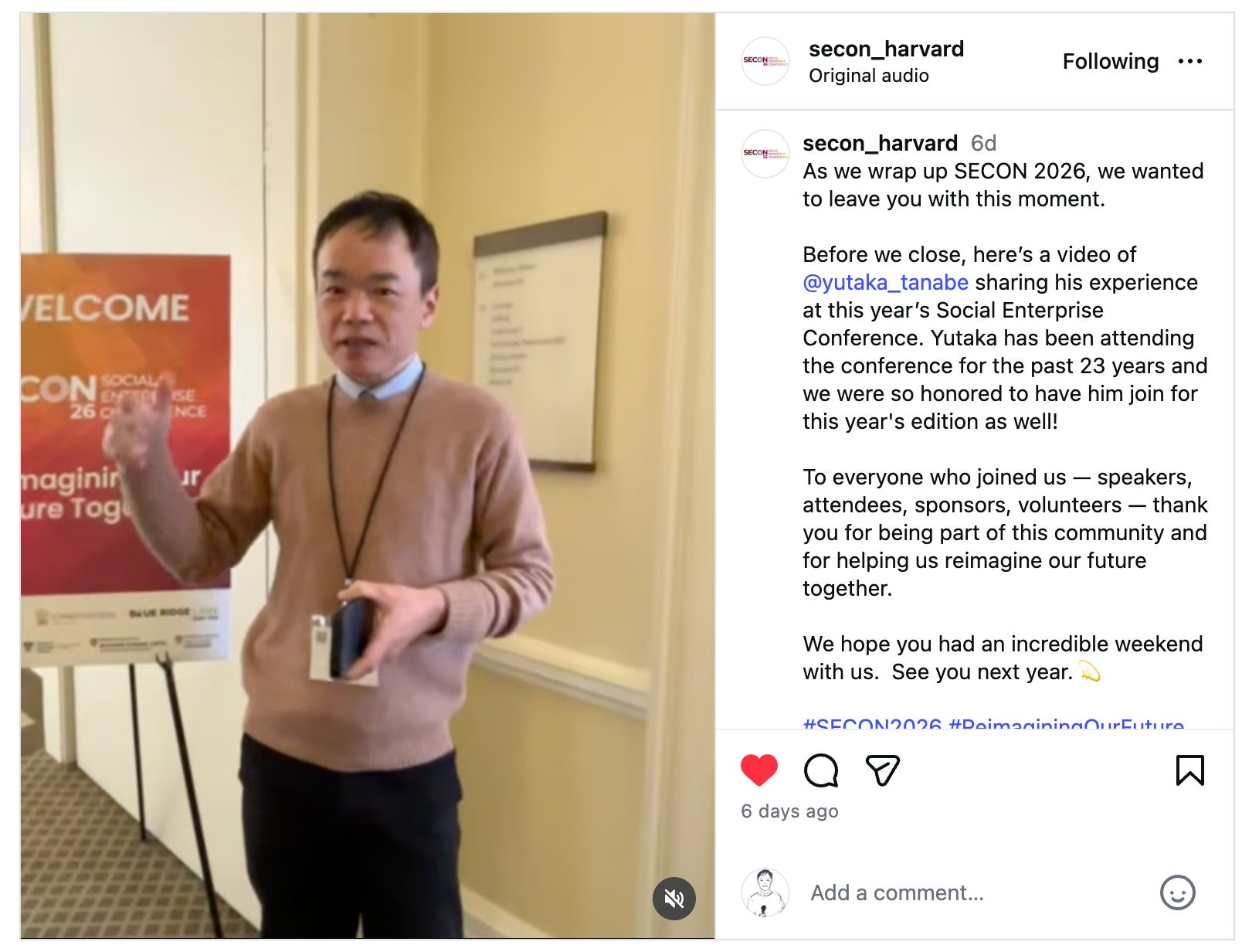 Harvard Social Enterprise Conference(SECON:「ハーバード社会事業大会」)は、ハーバードビジネススクールとハーバード・ケネディスクールの共催により2000年に始まった社会起業家の世界大会で、原則として毎年3月に開催されます。世界各地から社会起業家、投資家、研究者、NPO、企業関係者が集まり、社会課題の最前線と未来の社会像が議論される場として知られています。田辺は2003年大会に初めて参加し、その後24年間にわたり連続参加を続けています(2003年の初参加から数えて24回目)。今回のSECON2026では、田辺のインタビュー動画が大会公式SNSで紹介され、現在確認されている限り、日本人参加者がこのような形で大会公式SNSで紹介されたのは初めてです。