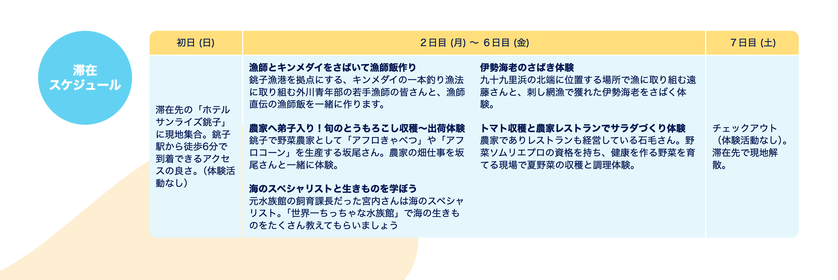 銚子プログラムでは、6泊7日の滞在期間中、畑・海・酪農にわたる多彩なアクティビティを体験できます。銚子駅から徒歩6分の好アクセスなホテルを拠点に、日中は子どもたちが地元の生産者と一緒にアクティビティに参加し、親御さんはWi-Fi完備の環境でテレワークが可能です。夕方以降は親子で銚子の食を楽しみ、家族の思い出を深める1週間です。
