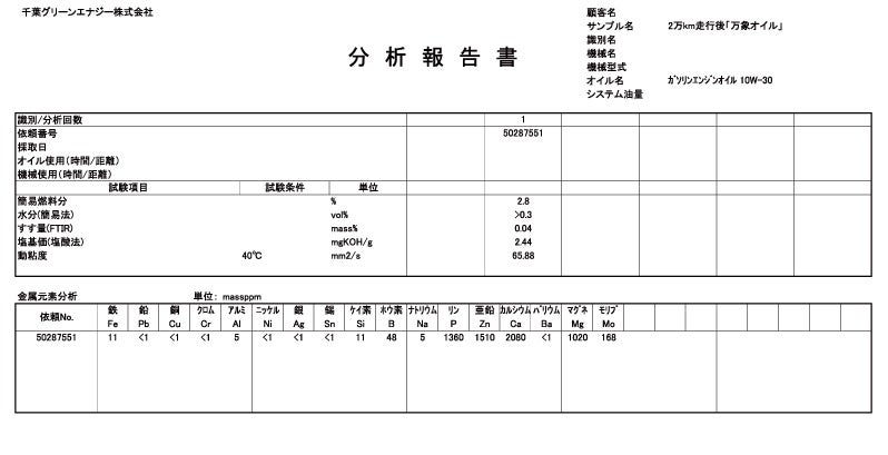 2万km走行後のエンジンオイルを第三者機関にて分析