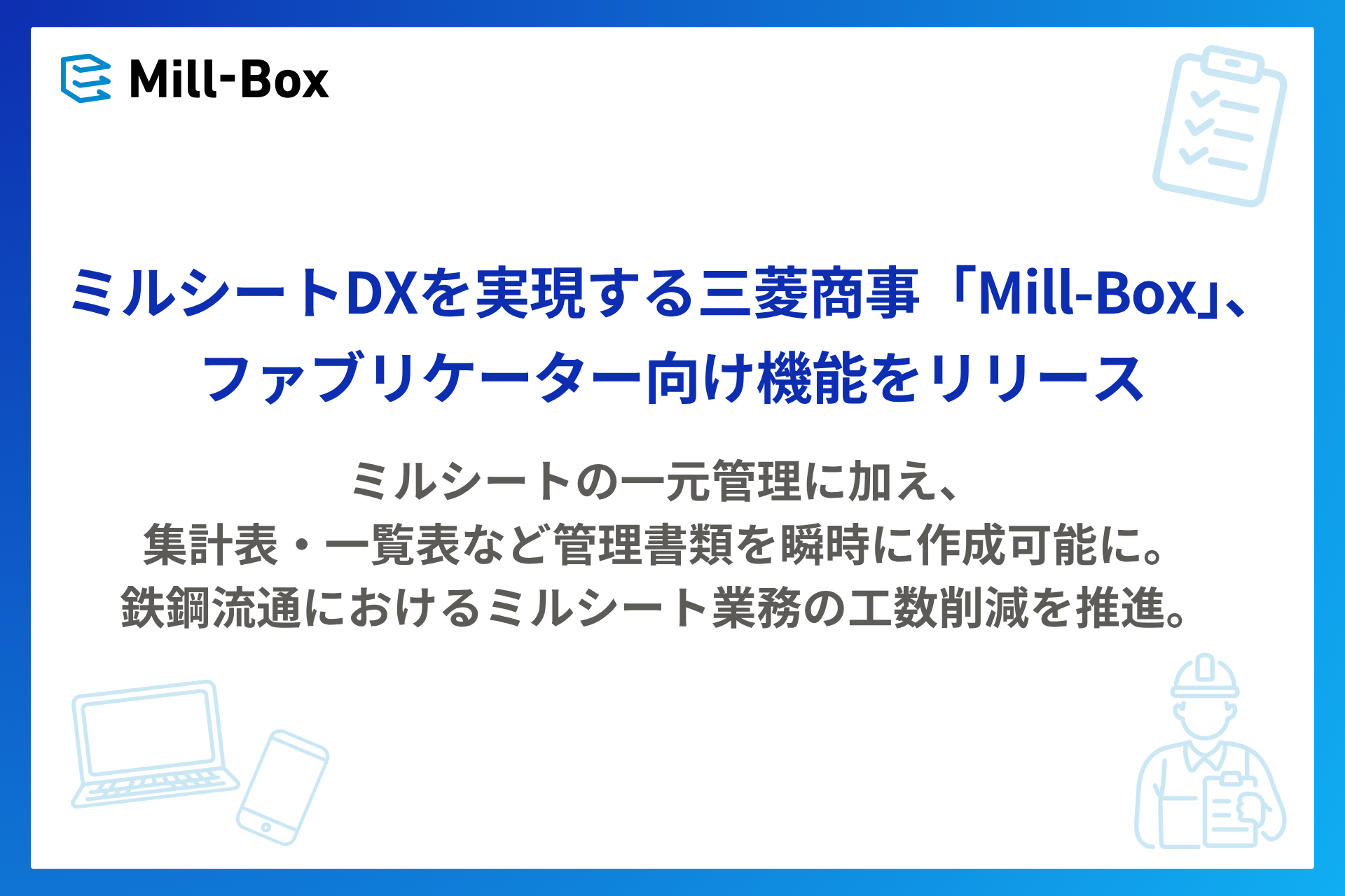 Mill-Boxは、現場の実務に根ざしたDXを重視し、開発 ‧ 運用支援を行っています。今後も現場のフィードバックを継続的にプロダクトに反映し、建設会社 ‧ 商社 ‧ メーカー ‧ 検査機関など、鉄鋼流通に関わるステークホルダーが連携しやすいミルシート管理の仕組みづくりを支援することで、業界全体の生産性向上に貢献してまいります。