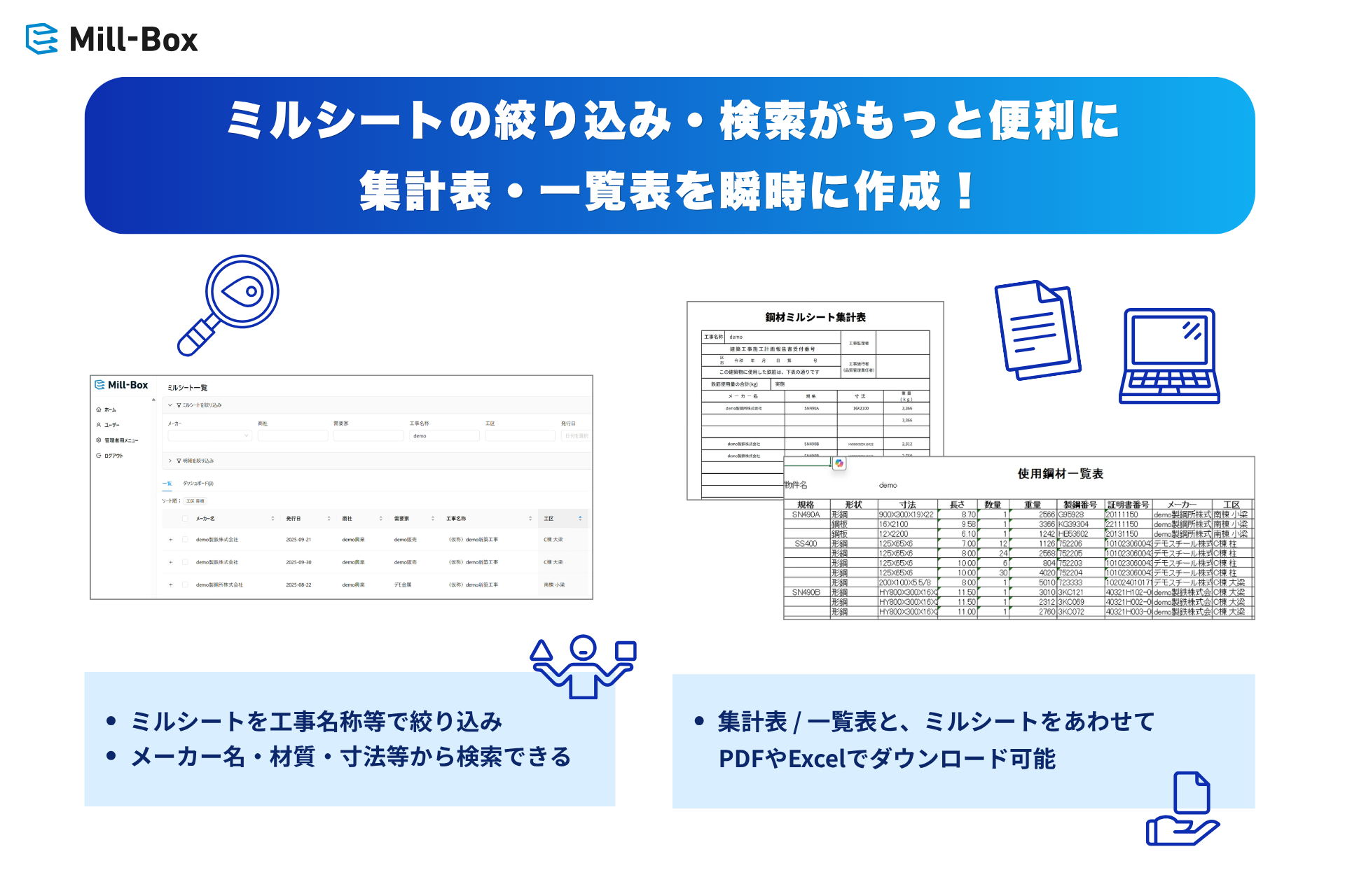 このたびリリースしたファブリケーター向け機能は、こうした課題を解決するために開発されました。Mill-Boxは、ミルシートのデータを一元管理するだけでなく、その情報をもとに集計表・一覧表などの管理書類を瞬時に作成することが可能です。