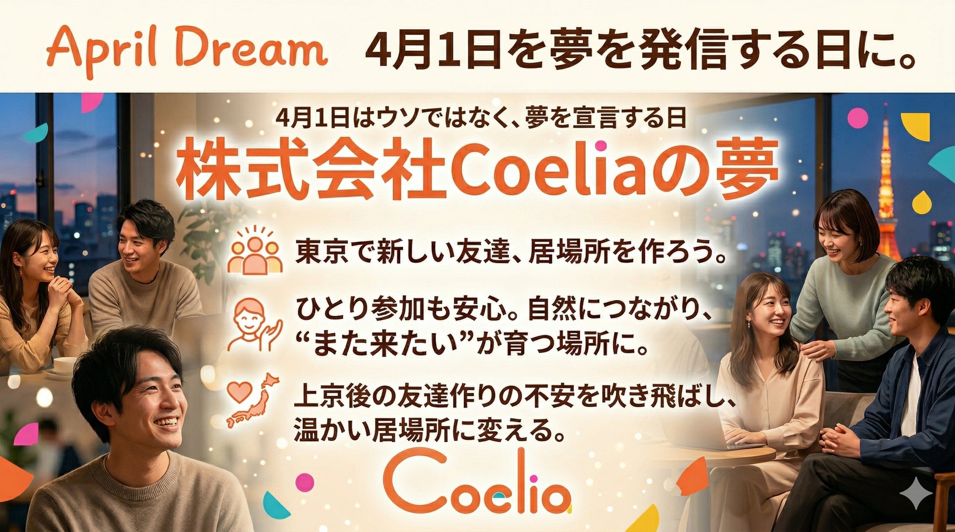 April Dreamでは、夢の発信にあたって、ミッションやビジョン、企業としての資産を整理すること、社会や業界の課題を広く捉えること、過去・現在・未来の時間軸で語ること、そして具体的で実現可能性を感じさせることが大切だと案内されています。Coeliaの夢は、まさに「春の友達作り」「上京後の孤独」「ひとり参加の不安」という社会に開かれた課題に向き合いながら、すでに動いているコミュニティと、2027年の常設拠点という具体的な未来をつないでいます。