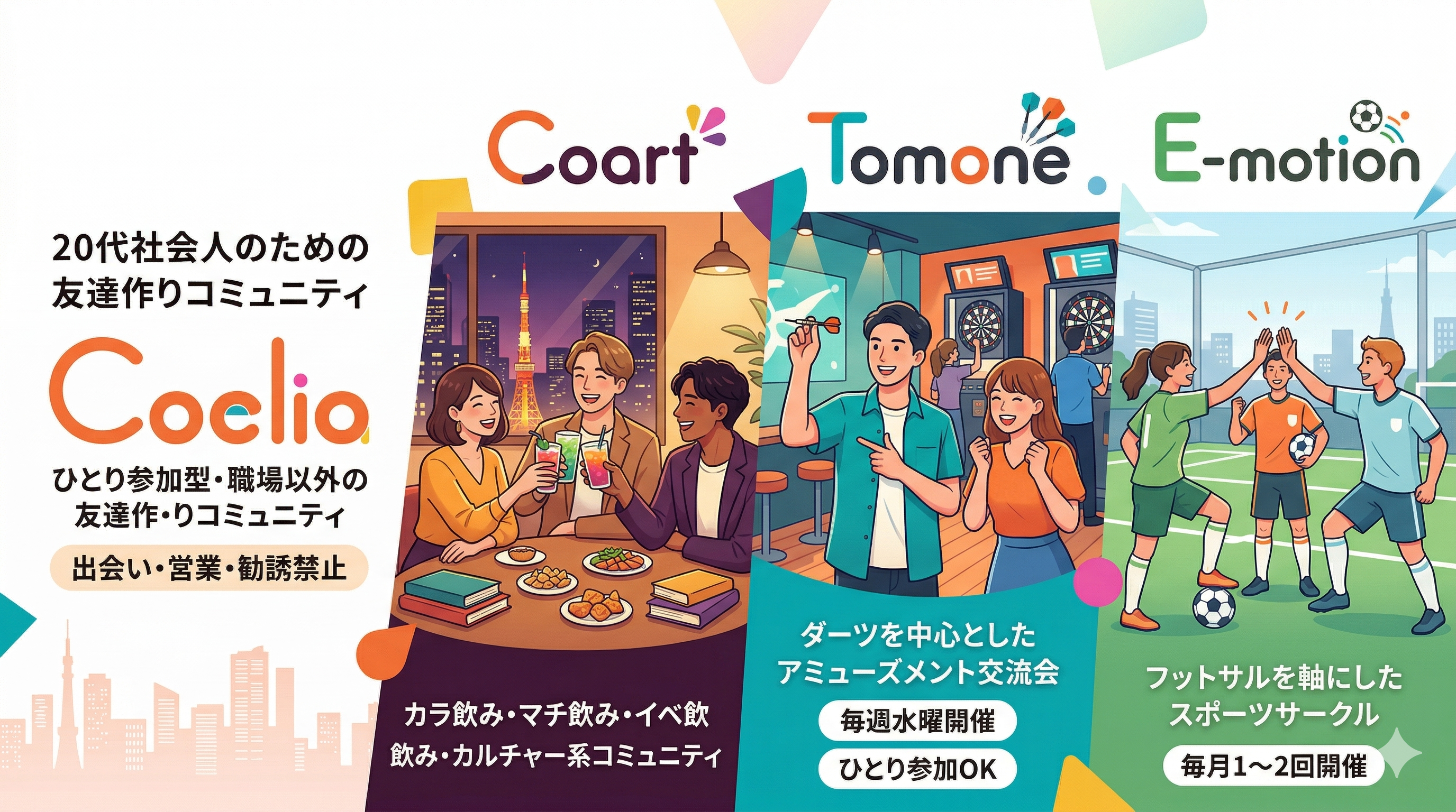 Coelia(コエリア)は、東京在住・在勤の20代社会人を対象にした友達作りイベントコミュニティです。