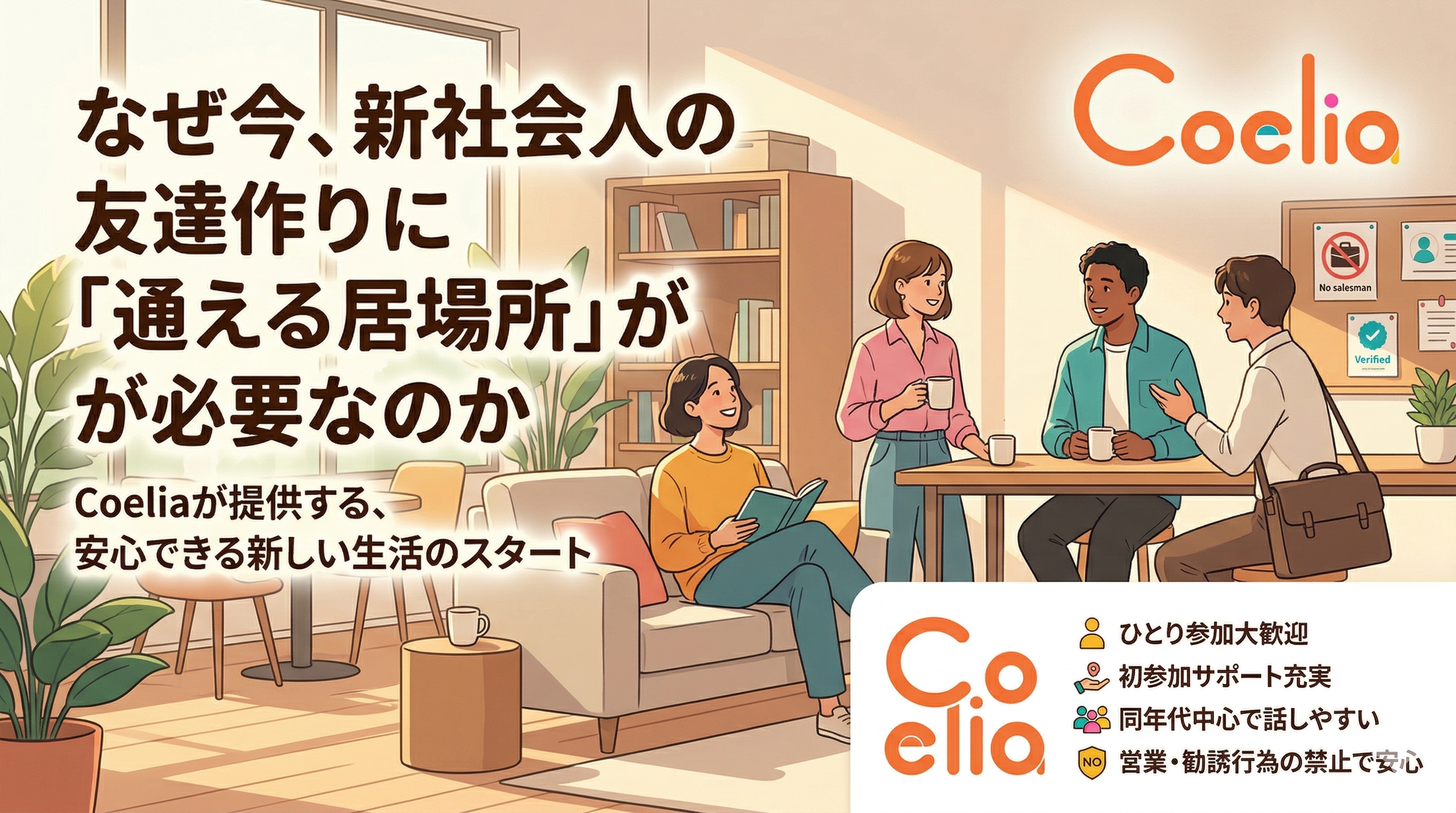 Coeliaは、ひとり参加歓迎、初参加の方が多いこと、導入サポートがあることを公開し、ガイドライン上でも営業・送客・引き抜き、MLM、投資、政治・宗教勧誘、ブラインド勧誘を禁止しています。本人確認や撮影・取材ルールを含め、安心・健全な場を守るルールも整えています。