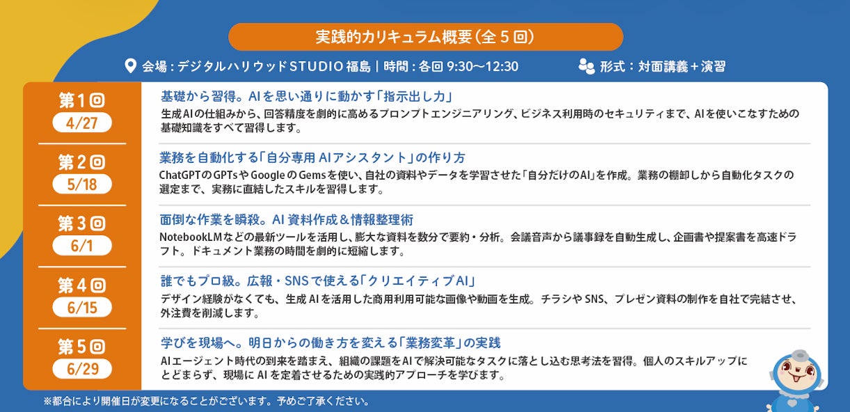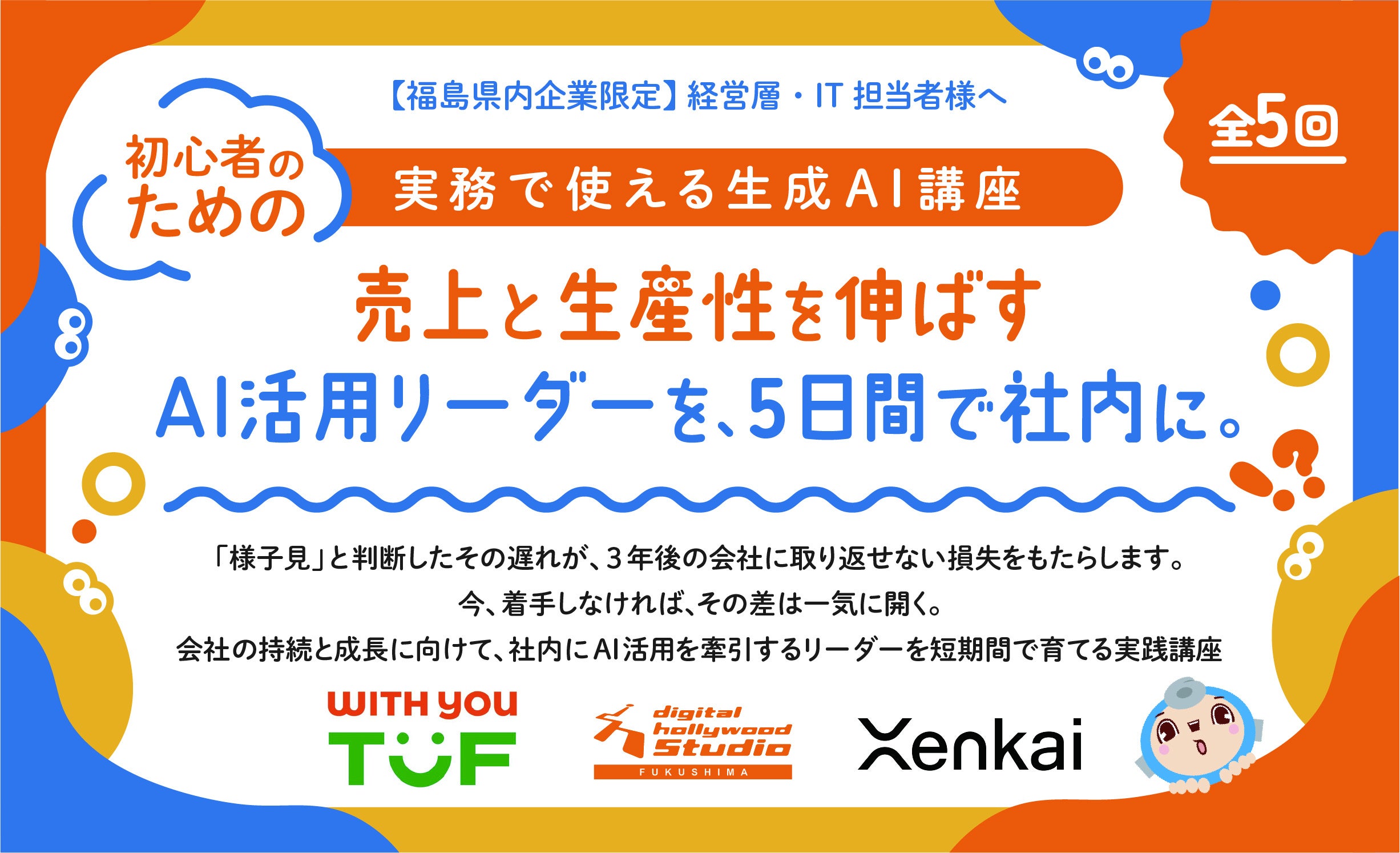Xenkai株式会社(本社:福島県福島市、代表取締役:渡邉 隆)は、株式会社テレビユー福島(本社:福島県福島市、代表取締役社長:仲尾 雅至 デジタルハリウッドSTUDIO福島を運営)と共催し、福島県内企業を対象とした「生成AI活用講座」(全5回)を、2026年4月27日(月)より開講します。