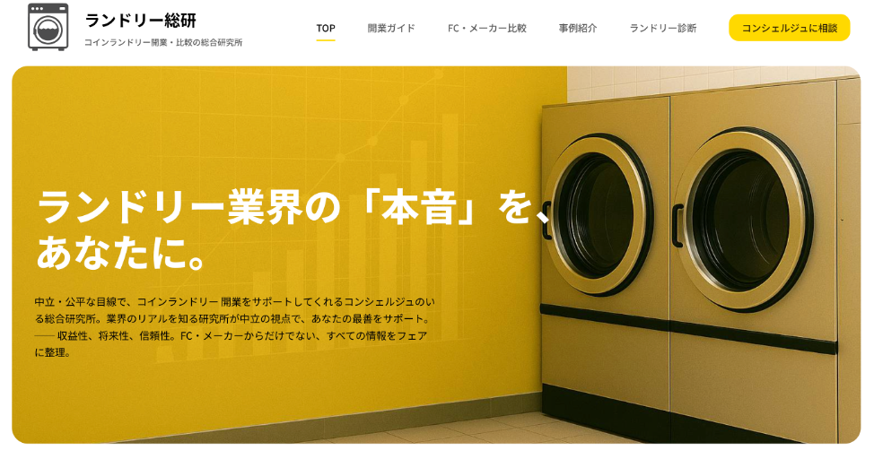ランドリー総研は、こうした課題を解消し、未来のコインランドリーオーナーが“最初の一歩”を迷わず踏み出せるよう、中立・客観的な立場から情報を整理し、ワンストップでサポートするメディアが必要だと考え、立ち上げに至りました。