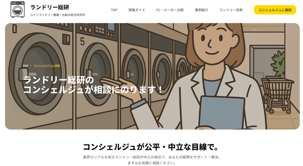 提供内容:開業ガイド/フランチャイズ比較/メーカー比較/オーナーインタビュー(事例紹介)/開業適正診断(ランドリー診断)/コンシェルジュ相談 他