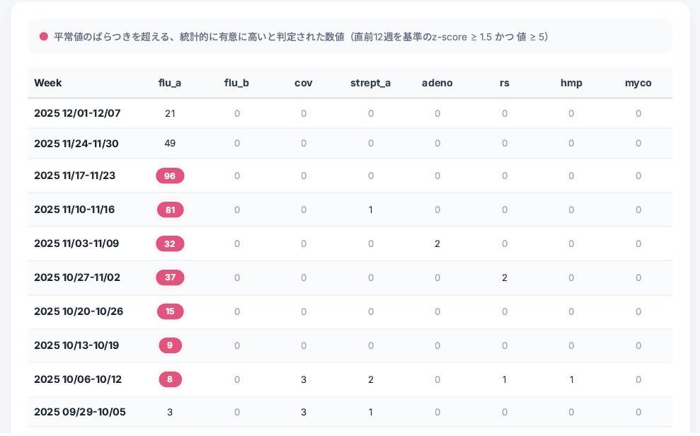 統計学に基づいた異常検知(z-score) 単なる集計に留まらず、統計的な異常検知ロジックを実装。「平年より多い」「急激に増加した」といった予兆を科学的に判定し、パンデミックの早期発見に寄与します。
