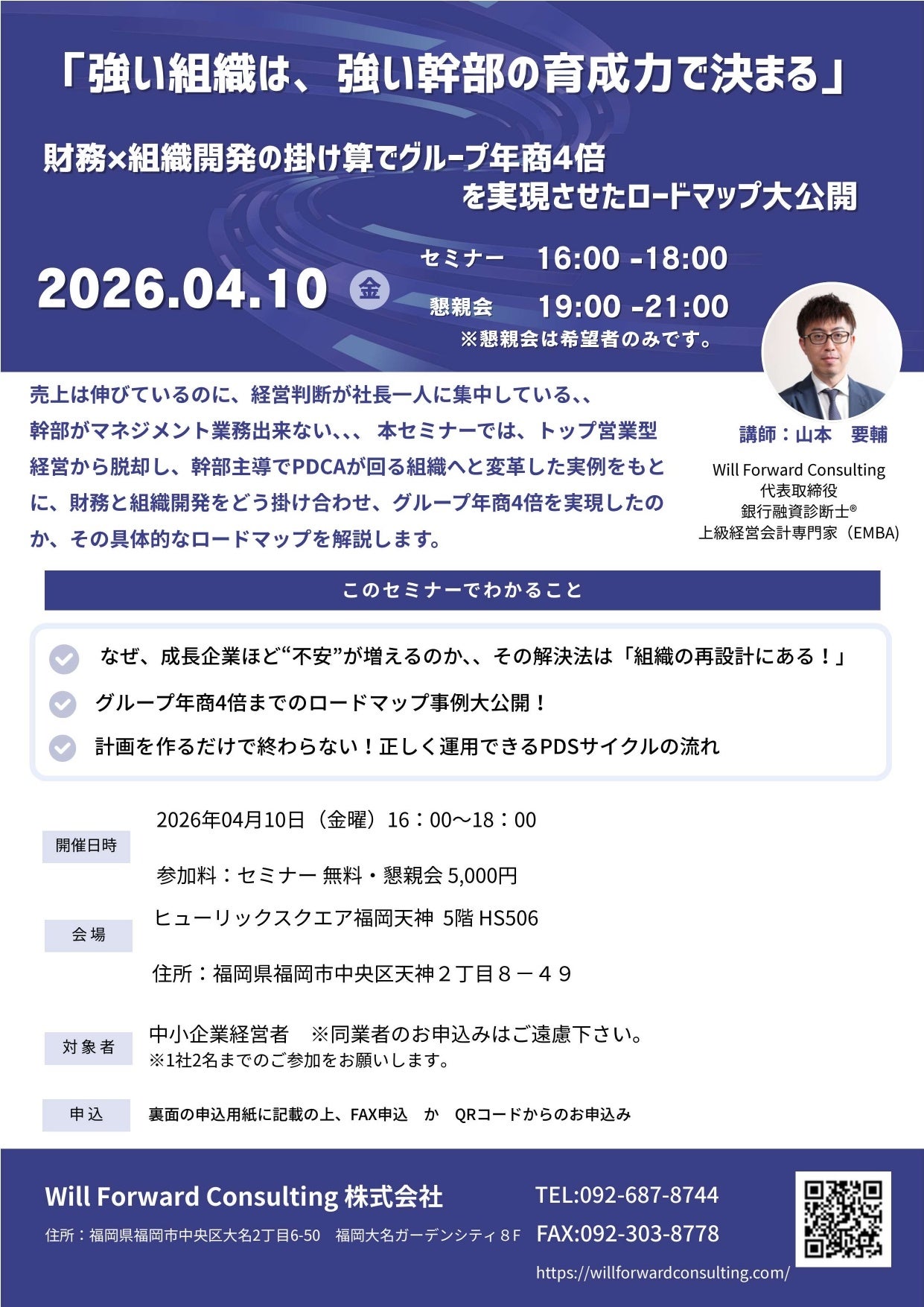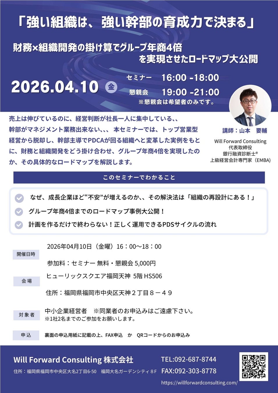 2026年4月10日、福岡天神の「ヒューリックスクエア福岡天神」にて開催された本セミナーには、志高い経営者の皆様にお集まりいただきました。