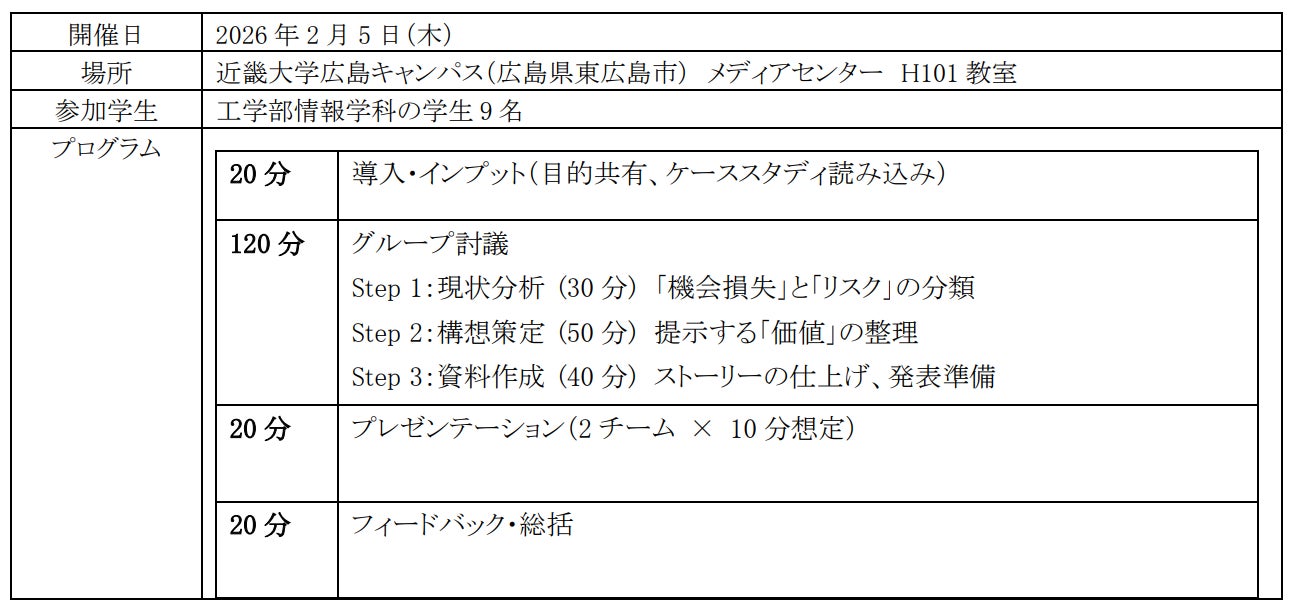 株式会社NTTデータ グローバルソリューションズ(本社:東京都中央区、代表取締役社長:木村 千彫、以下 NTTデータGSL)は、近畿大学工学部情報学科(所在地:広島県東広島市、学科長:古川 亮)の学生向けに、SAPコンサルタントとして実際に求められる上流業務の「構想策定」フェーズが体験できるイベントを、2026年2月に実施しました。