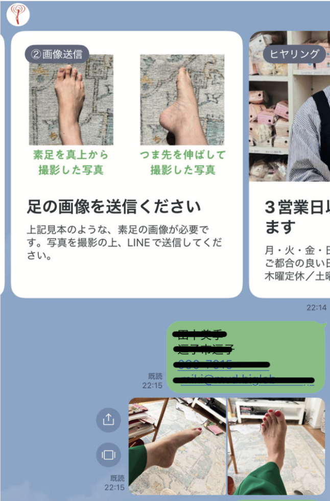 店舗の公式LINEを通じてお客様の足の様子がわかる写真をお送りいただき、ヒアリングを経て、その方に最適なトウシューズ3足をご自宅へ郵送。1週間試していただきベストなシューズを選んでいただくというサービスです。