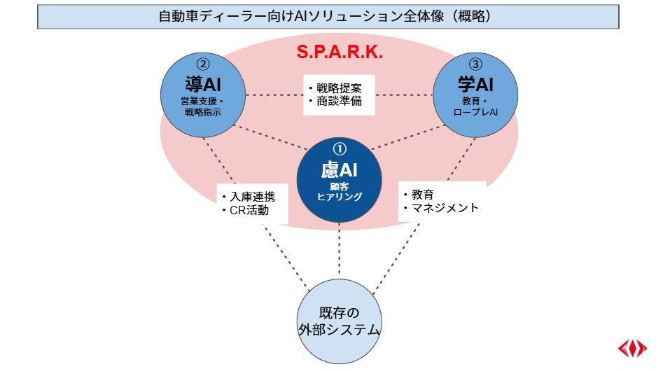 今回の協業では、「S.P.A.R.K.」のプラットフォーム上に、以下の3つの機能を持つAIソリューションを構築します。本ソリューションは既存の外部システムの入庫情報やCR(カスタマー・リテンション)活動情報にも連携します。