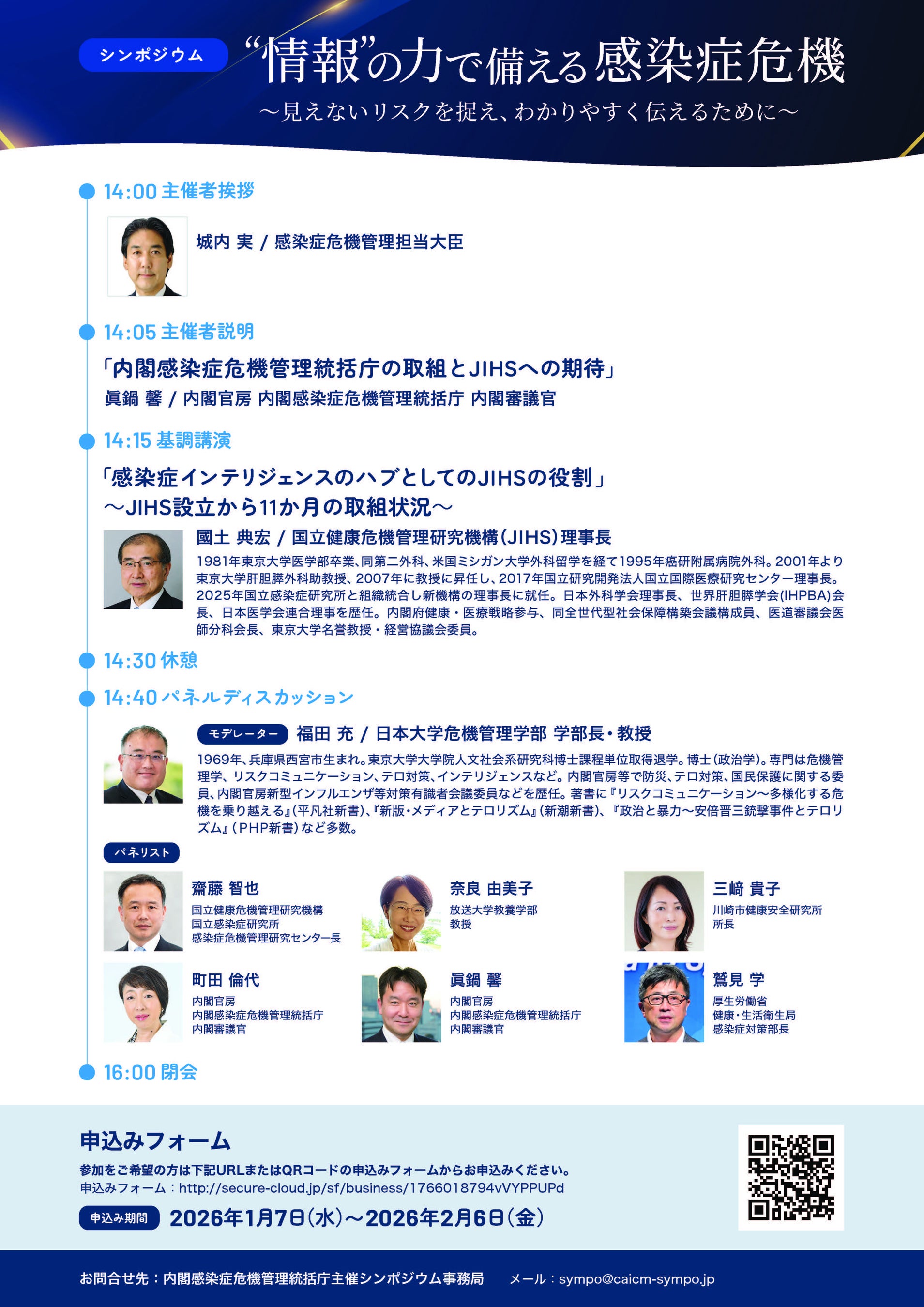 感染症の早期発見と情報の収集・分析により迅速なリスク判断を行う「感染症インテリジェンスの構築」と、そのリスク情報と見方の共有を目指す活動である「リスクコミュニケーション」という2つのテーマを軸とした内閣感染症危機管理統括庁主催シンポジウムを、下記のとおり開催します。