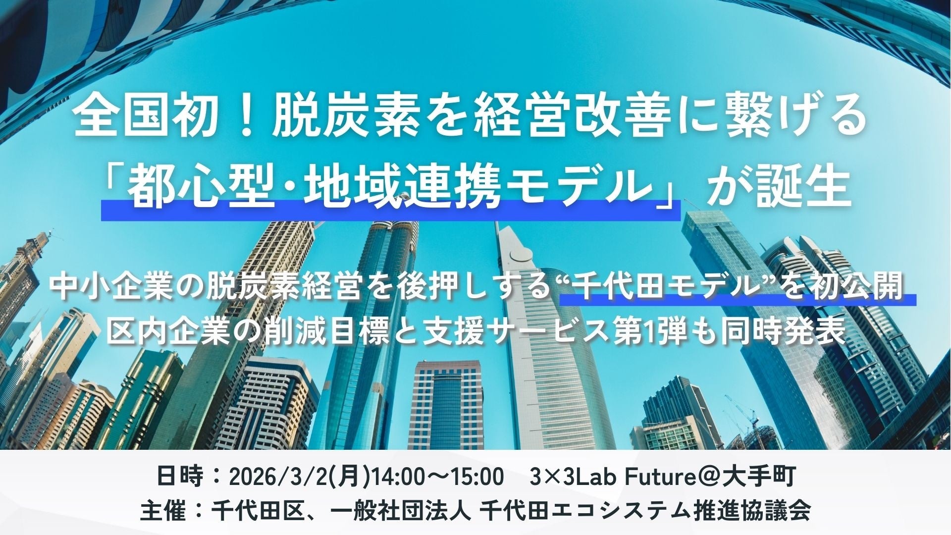 千代田区は、全国初となる「都心型・地域連携モデル(千代田モデル)」の発足を宣言します。2025年度に実施した「ちよエコ未来企業スクール」参加企業によるCO₂削減目標の公開に加え、「中小企業向けの脱炭素支援サービス・製品」第1弾を2026年3月2日(月)14時から発表いたします。