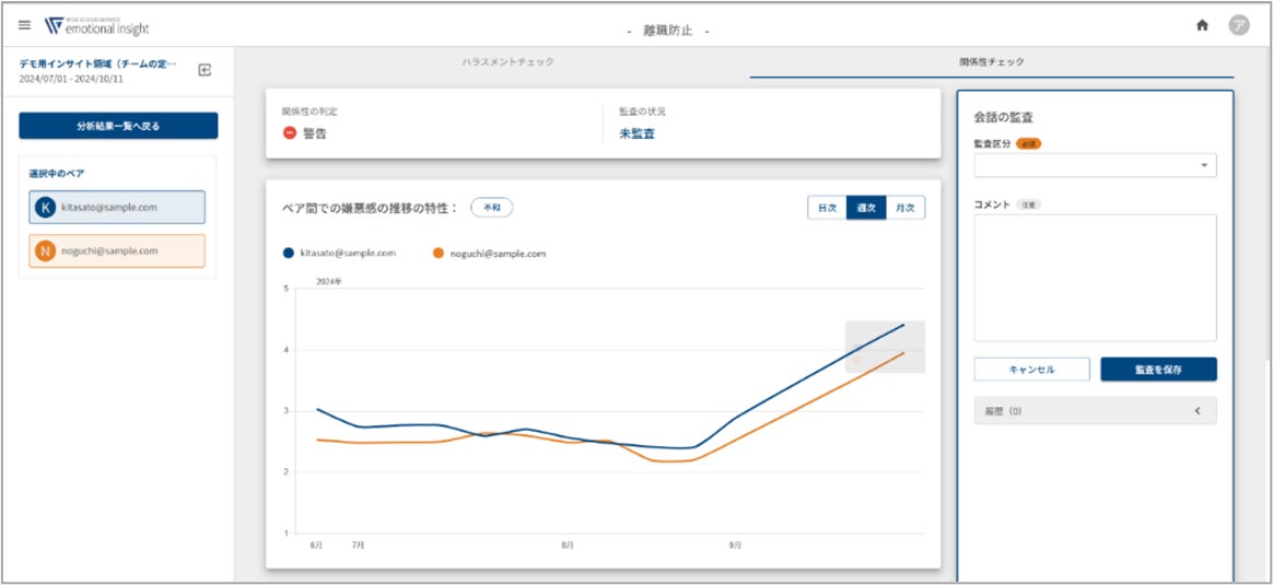 AIが行為の危険度と受け手が感じた嫌悪感の二つの視点から、一つ一つのメッセージに対してスコアリングし、双方の”感情の変化”を時系列ラインチャートで可視化します。スコアリングの結果、リスクの高いメッセージを確認し監査結果を記録、レポートとして提出することも可能です。また、これらの情報から人間関係悪化のリスクが高いペアを警告表示することで、多数の従業員から効率的に問題を発見することが可能です。