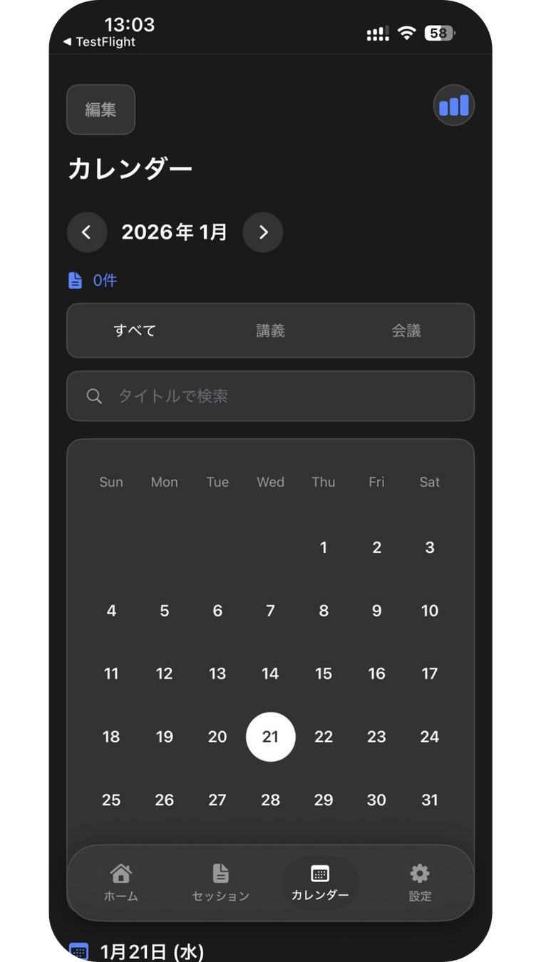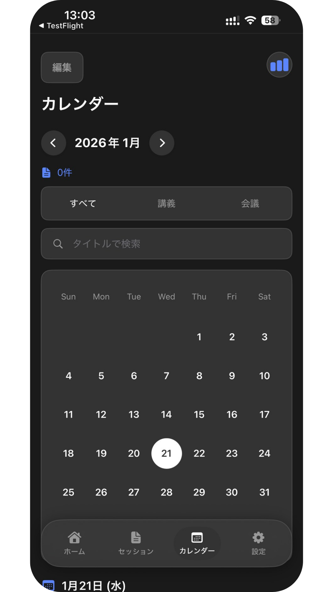 セッション画面にて、日時から過去の記録をすぐに振り返ることが可能です。(Google Calendarは今後搭載予定)