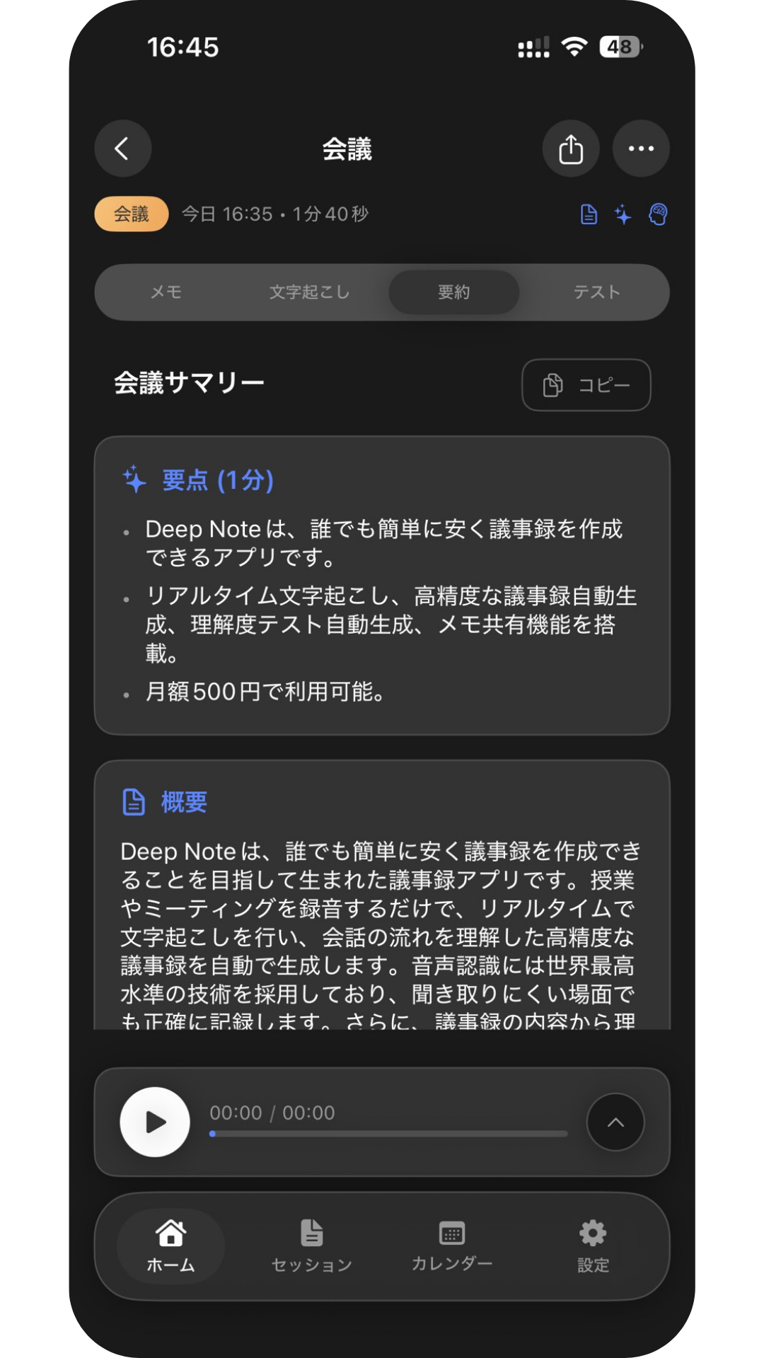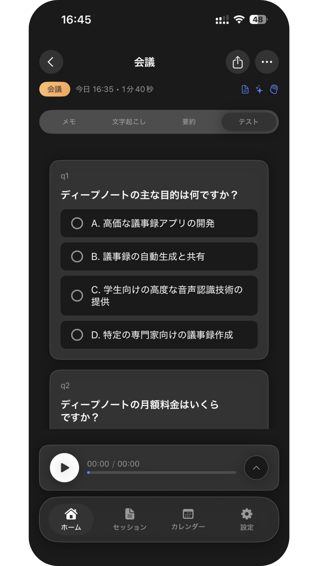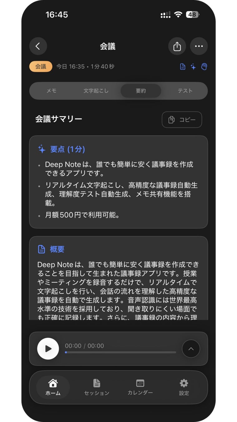 リアルタイム文字起こし、議事録、テスト生成、共有、カレンダー連携までをすべて提供。学生から社会人まで、誰もが使い続けられる新しい議事録体験へ。