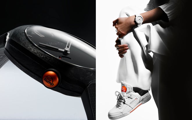 アイコニックかつ型破りなスポーツカルチャーブランドであるReebok(リーボック)とのコラボレーション。1980年代に一世を風靡した「ポンプシューズ」の象徴的な操作感から着想を得て、H.モーザーはその“押す”という行為を、機械式時計の巻き上げ機構として再解釈しました。プッシュボタンを1回押すことで約1時間分のパワーリザーブを確保。機構そのものを体験として楽しめる設計と、ストリームライナーならではの大胆かつ洗練されたデザインが融合しています。