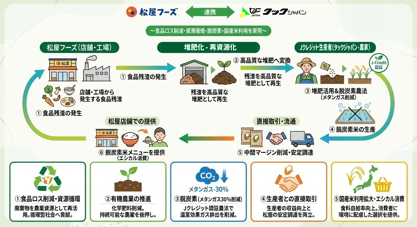 株式会社タックジャパン(本社:岐阜県大垣市、代表取締役:髙橋卓哉、以下「当社」)は、株式会社松屋フーズホールディングス(本社:東京都武蔵野市、代表取締役社長:瓦葺一利、以下「松屋」)と連携し、松屋の店舗および工場から発生する食品残渣を堆肥として再資源化、その堆肥を用いて当社顧客である水稲生産者がJクレジット認証農法で栽培した「脱炭素米」を松屋店舗で提供する「循環型フードチェーンモデルの展開」を開始致します。本取組により、「食品ロス削減・有機農業の推進・脱炭素(メタンガス30%削減)・国産米の安定調達を同時に実現」します。