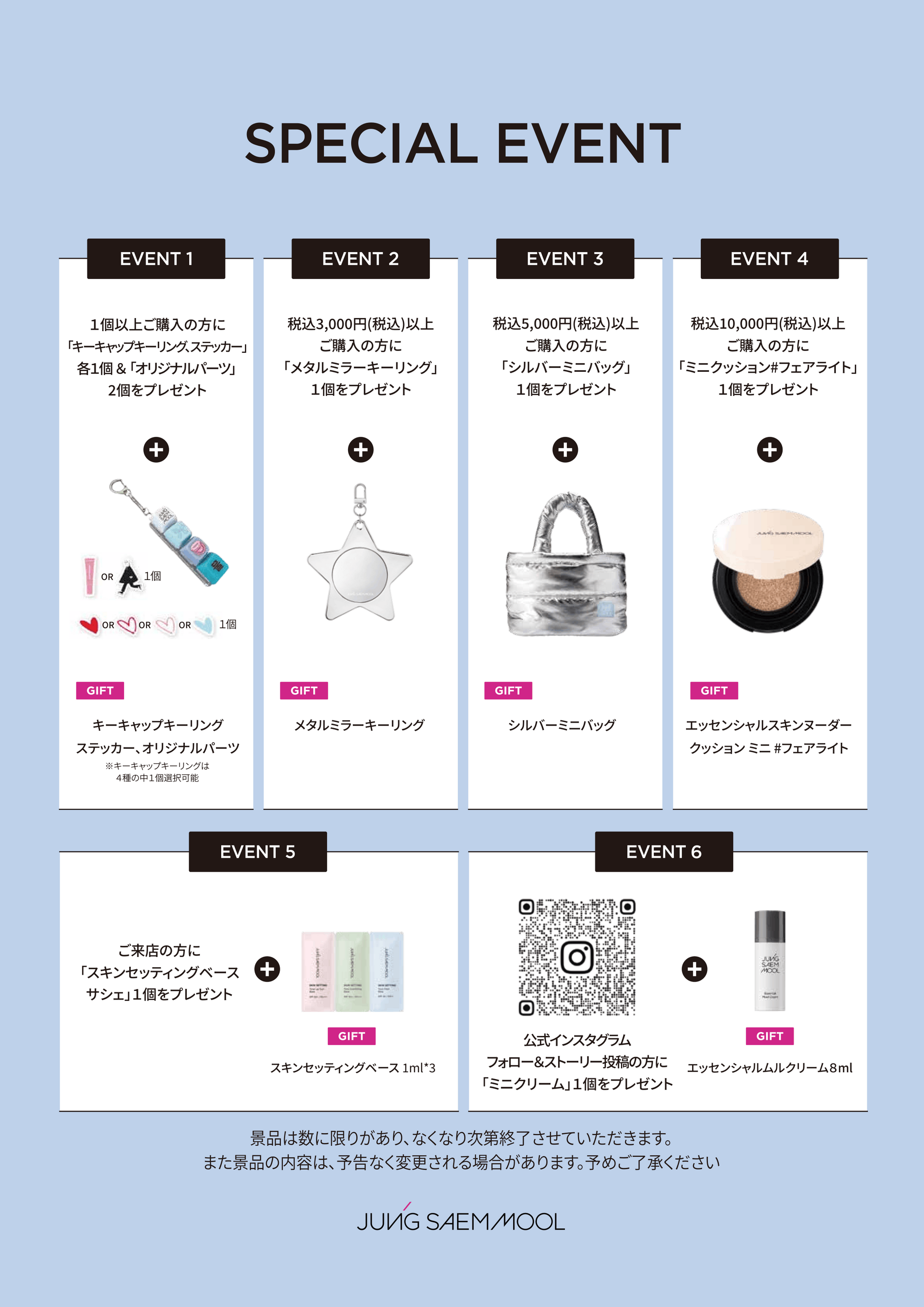 また、商品ご購入でポップアップ限定のキーチャームやミニコスメなどの特典がもらえるスペシャルイベント※もご用意しています。ジョンセンムルがお届けする、夏のベースメイクに特化したPOPUPにぜひ足を運んでみてください。