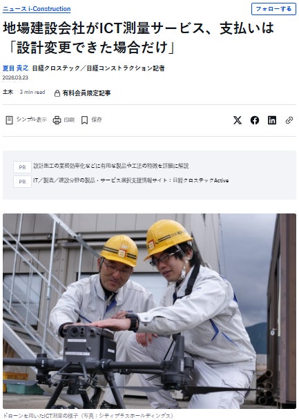 株式会社シティプラスホールディングス(本社:愛媛県新居浜市)が提供するICT測量アウトソーシングサービス「ソクプロ」が、建設・IT分野の専門メディアである日経クロステックに掲載されました。