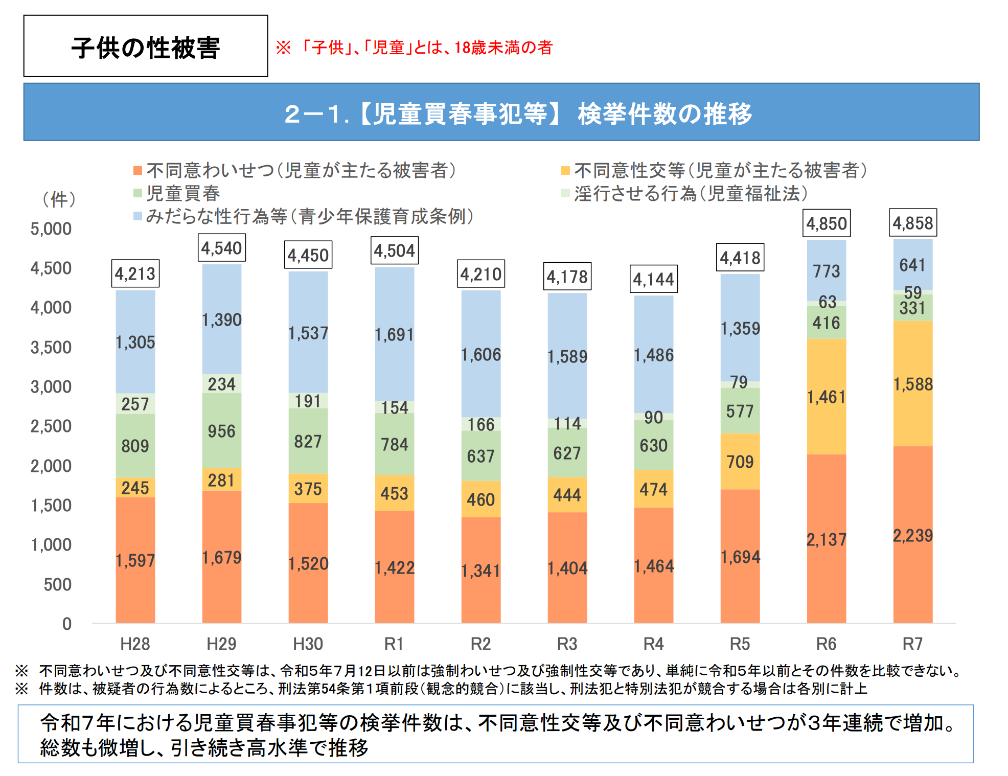 昨今、子どもに対する性犯罪・性暴力が深刻化しています。警察庁の最新データによると、児童買春事犯等の検挙件数は年間のべ約5,000件と高水準で推移しており、近年では、不同意わいせつ・不同意性交等が大幅に増加していることが明らかになっています。