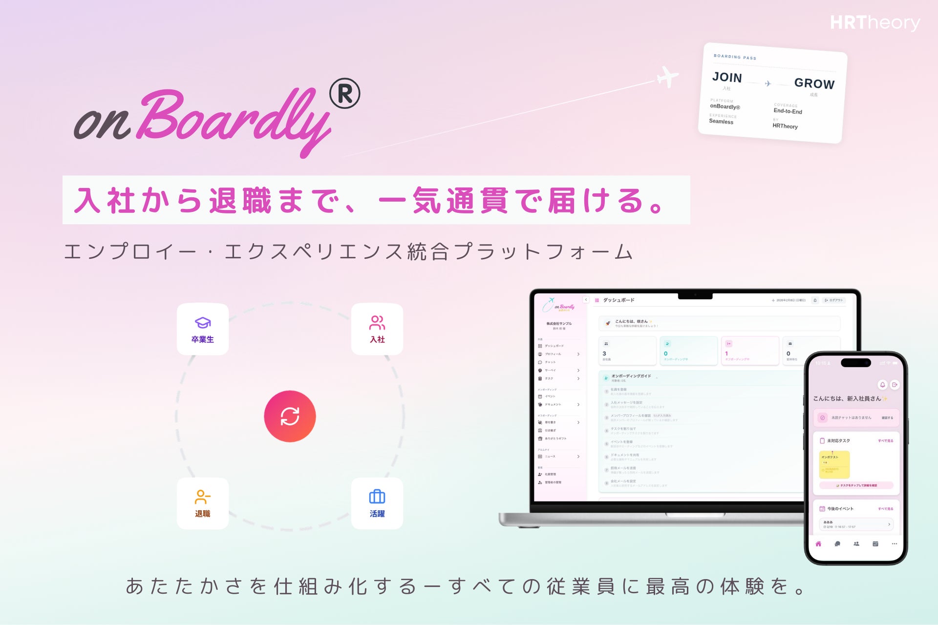 HR Tech SaaS を展開する株式会社HRTheory(本社:京都府京都市下京区、代表取締役:吉田琴乃)は、オンボーディング支援SaaS「onBoardly®(オンボードリー)」を、従業員の入社から退職・アルムナイ管理までを一気通貫で支えるエンプロイー・エクスペリエンス統合プラットフォームへ大幅にアップデートしました。従来のオンボーディング機能に加え、個社カスタムサーベイ、チーム相関図、AI引継ぎチャット、アルムナイ管理を新たに搭載し、エンプロイー・ライフサイクル全体を一つのプラットフォームでカバーします。