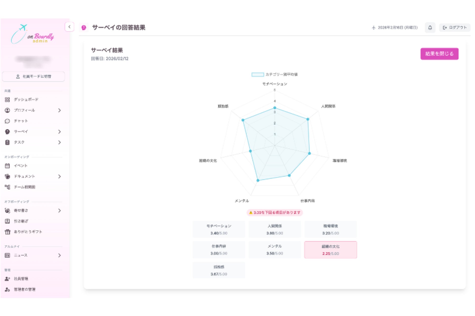 個社ごとにカスタマイズできるエンゲージメントサーベイを搭載。結果は7カテゴリのレーダーチャートで可視化され、基準値を下回る項目は自動フラグで通知されます。簡易サーベイ(日次・週次)により、日常の変化も捉えます。