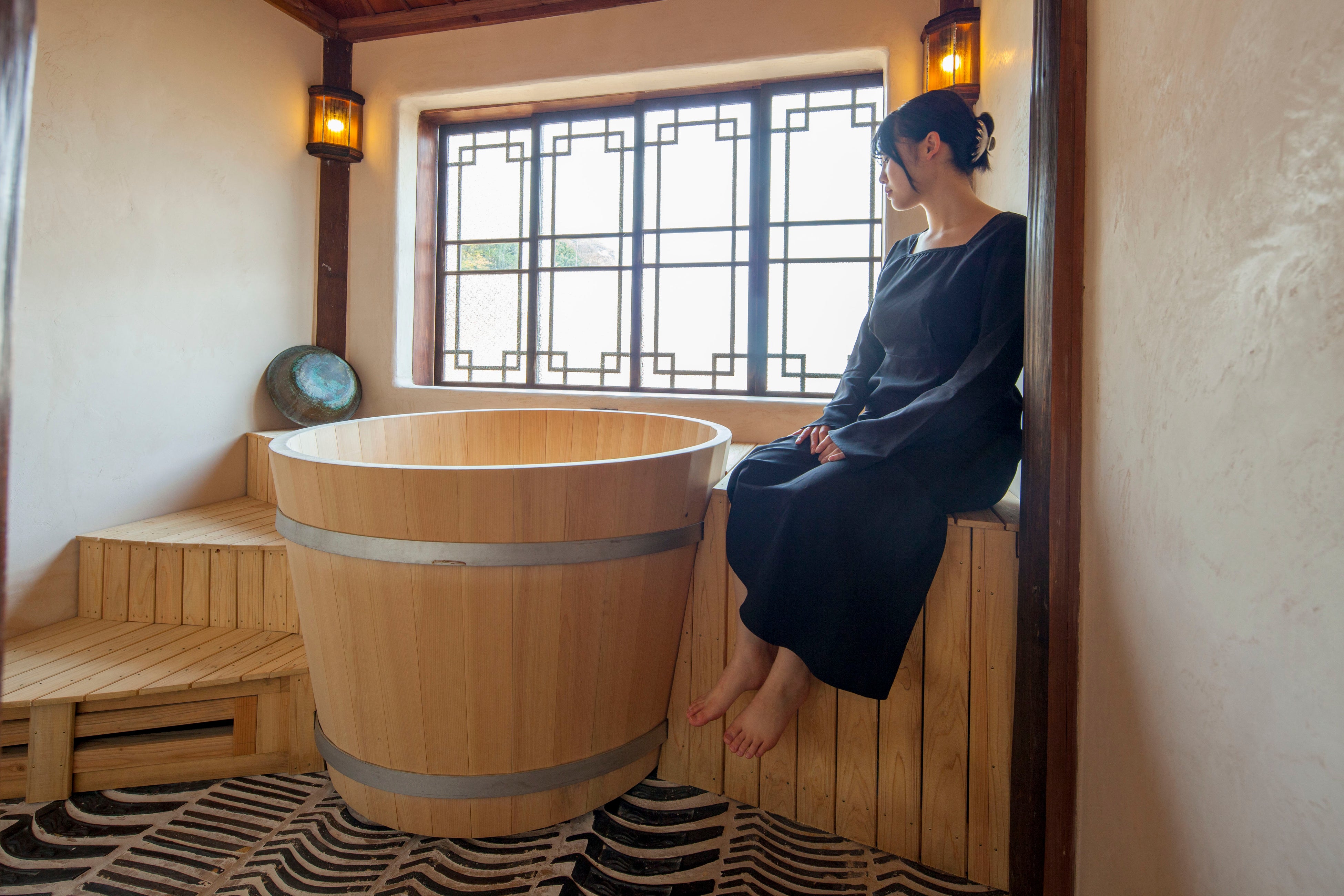 そのコンセプトは、空き家と空き家を掛け合わせる「空き家のドッキング」です。輪島屋の改修にあたり、県内の別の空き家(昭和初期の住宅)を手解体し、そこで出た部材をフル活用しました。古い風呂の天井板を「輪島屋」の個室風呂の天井として再利用し、解体した屋根瓦をスライスして風呂の床に敷き詰め、古箪笥の板を内装の化粧板としてよみがえらせました。