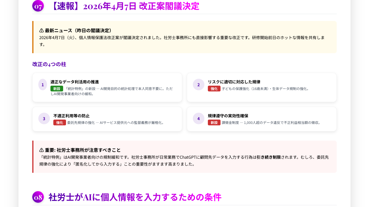 重要な点として、「統計特例」はAI開発事業者向けの規制緩和であり、一般の中小企業がChatGPT等に顧客データを入力する行為は引き続き規制の対象です。むしろ委託先規律の強化により、「匿名化してから入力する」ことの重要性がますます高まっています。