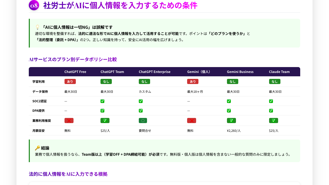 【第2層:DPA(データ処理契約)の締結】AIサービス事業者との間で「委託」としての法的整理を完了し、第三者提供の例外として運用。個人情報保護法第27条5項1号に基づき、本人同意なしでの業務利用が法的に担保されます。