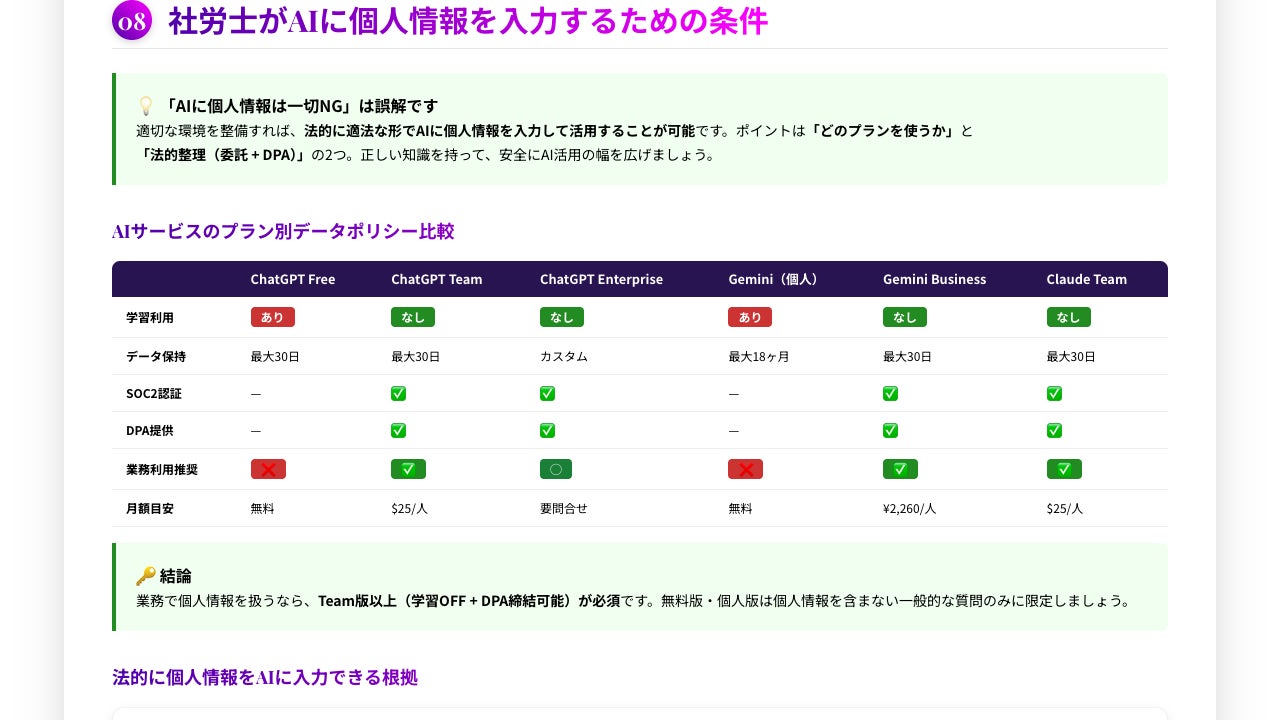 この匿名化処理を施したデータであれば、個人情報保護法上の「個人情報」に該当しなくなるため、どのプラン・どのAIサービスでも安全に入力・分析が