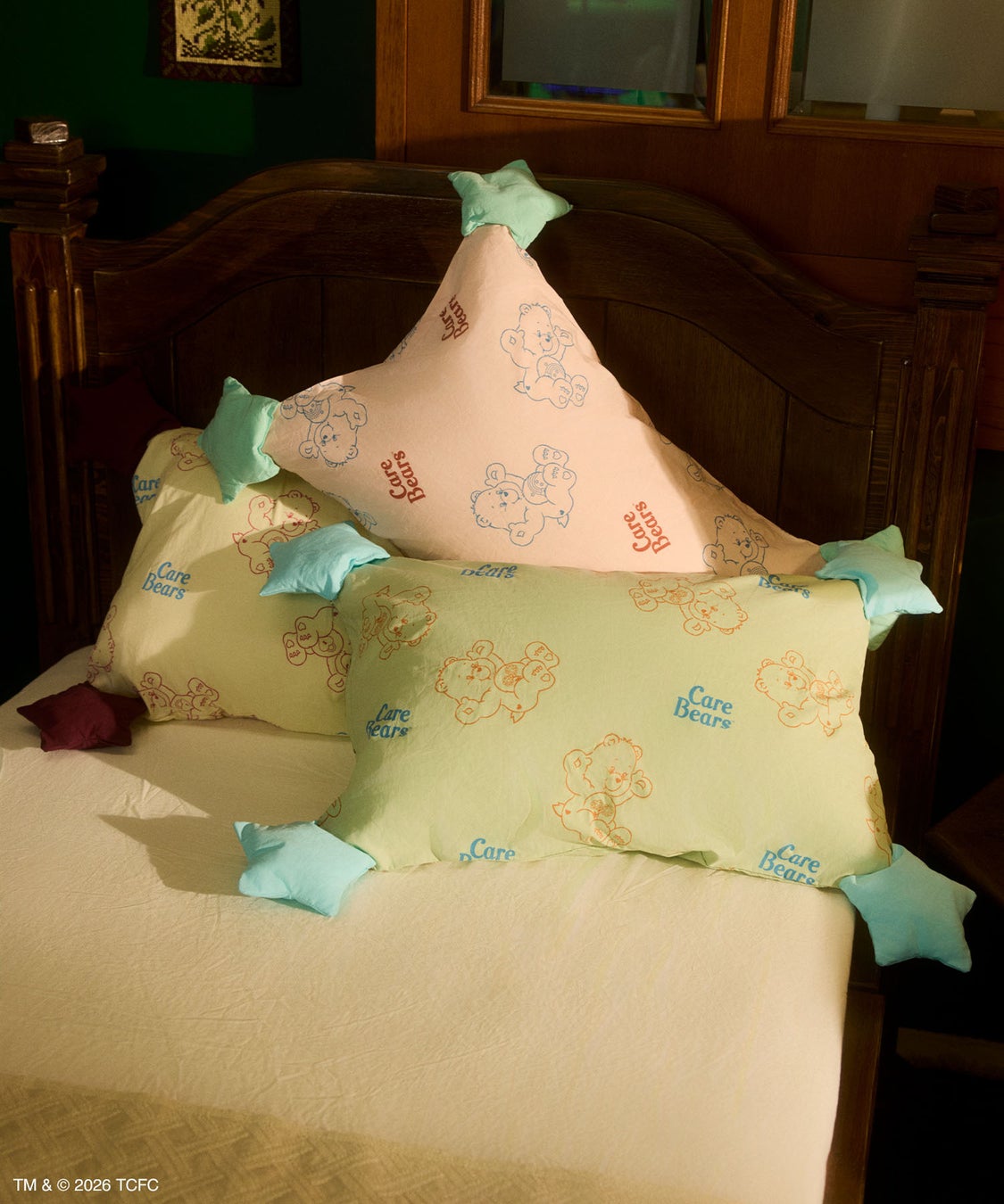 Care Bears™の世界観を象徴する“星”から着想し、星が零れ落ちるようなイメージを四隅の立体モチーフで表現しました。やさしい総柄デザインに、ぷくっとした星がアクセントとなり、遊び心のあるアイテムです。