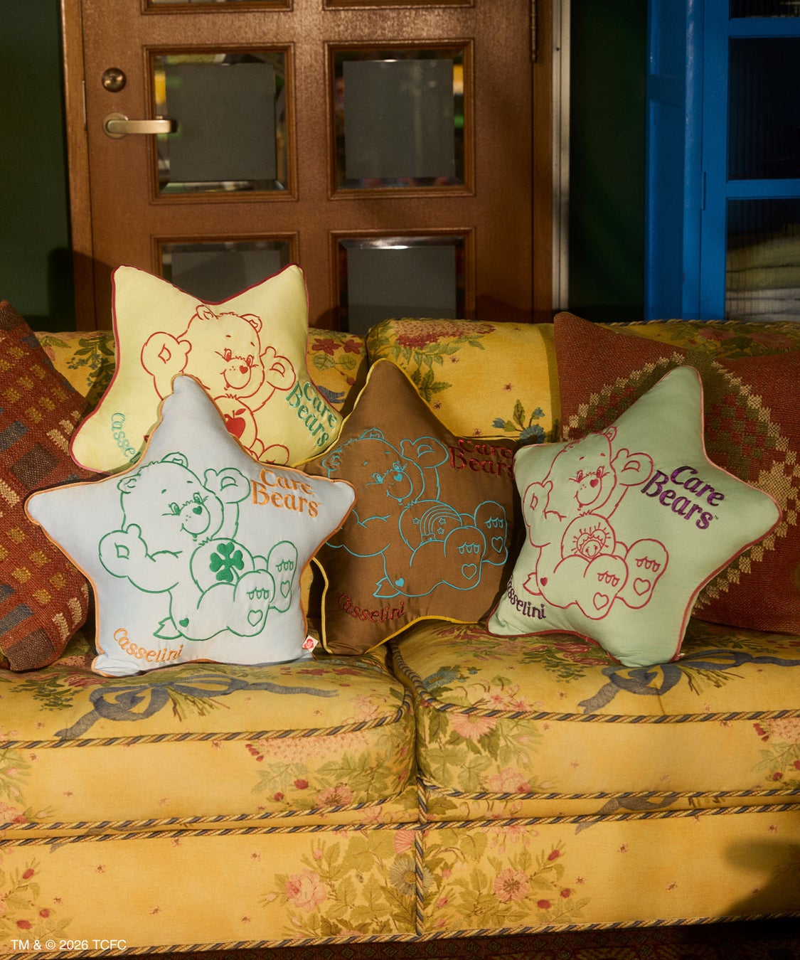 大きなCare Bears™の刺繍がポイントの星形クッションです。異なる質感の刺繍糸を組み合わせることで表情に奥行きが生まれ、さりげない遊び心と全体のバランスを意識したアイテムです。