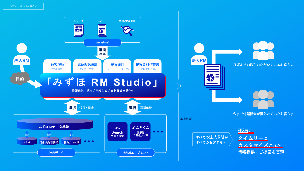 株式会社みずほフィナンシャルグループ(執行役社長:木原 正裕)は、傘下の株式会社みずほ銀行(取締役頭取:加藤 勝彦)の法人営業を担うRM(Relationship Manager)の提案業務を支援する統合AIアプリケーション「みずほRM Studio」を開発し、本格展開を開始します。