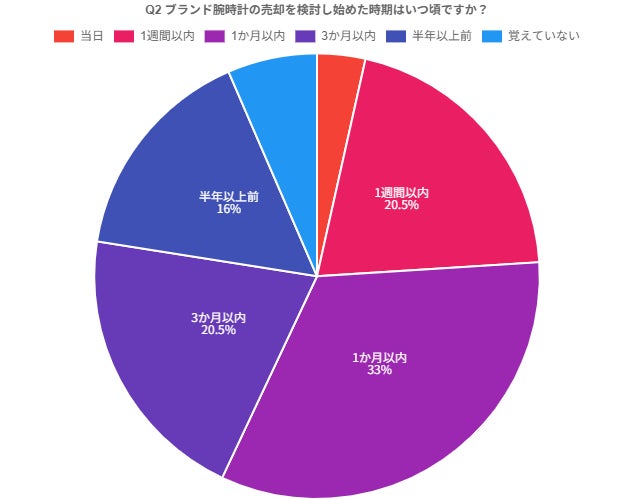 売却の検討開始時期は「1か月以内」(33%)が最多。「1週間以内」(20.5%)と「当日」(3.5%)を合わせると、57%が“1か月以内”に検討を開始。