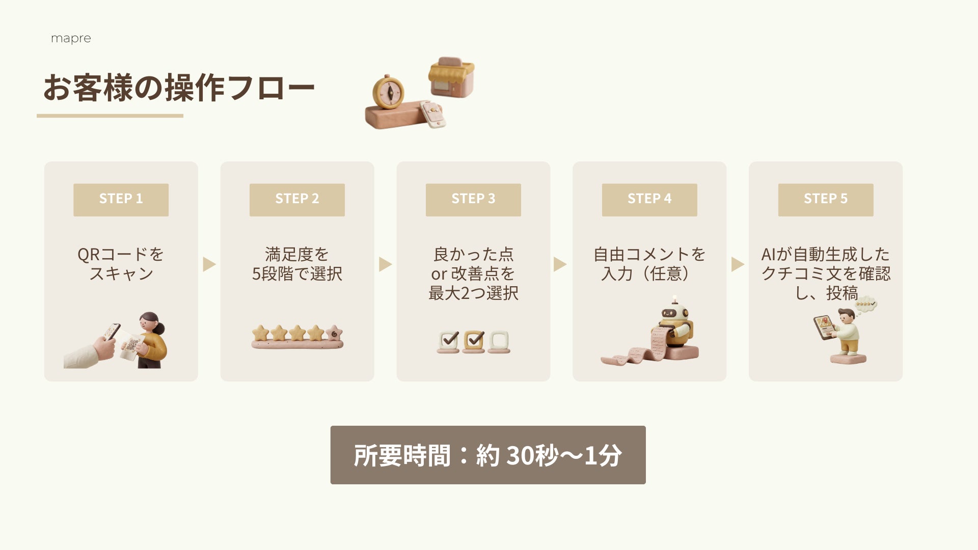 mapreは、来店されたお客様がQRコードを読み込み約1分の簡単なアンケートに回答するだけで、AIが業種や店舗の特性に合わせた自然なクチコミ文を自動生成するサービスです。「クチコミを書きたいけど何を書けばいいかわからない」というお客様の負担と、「クチコミをお願いしづらい」という店舗スタッフ様の悩みを同時に解消し、店舗の集客力向上を支援します。