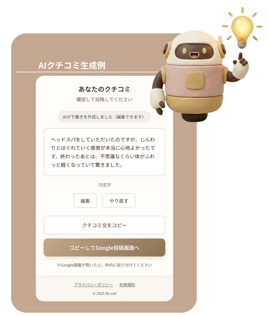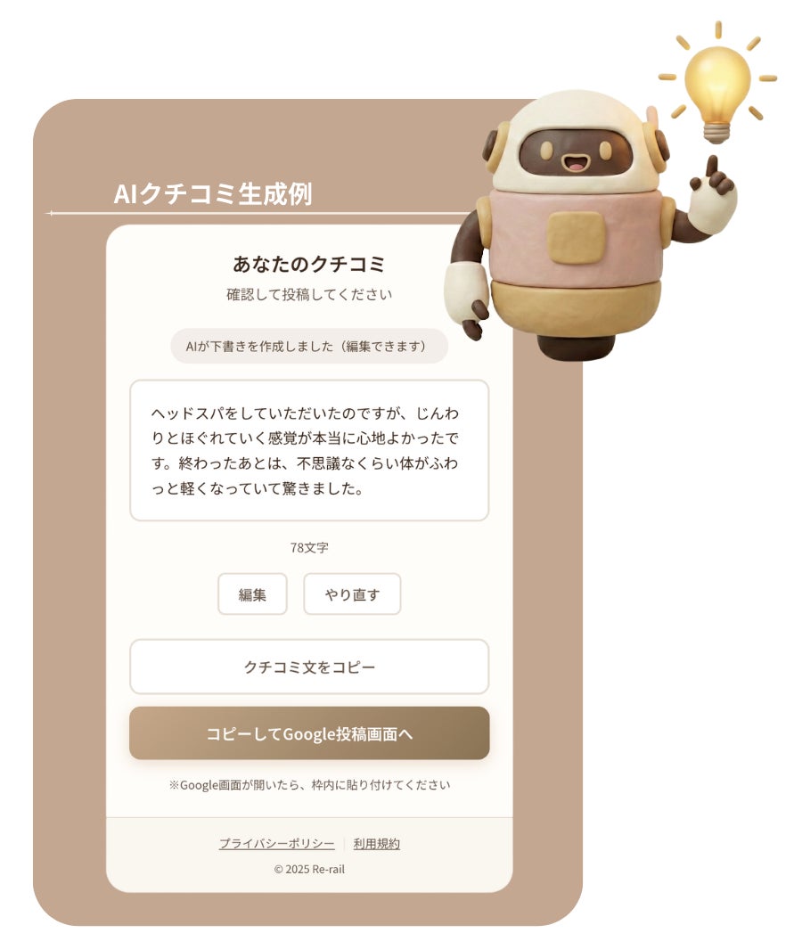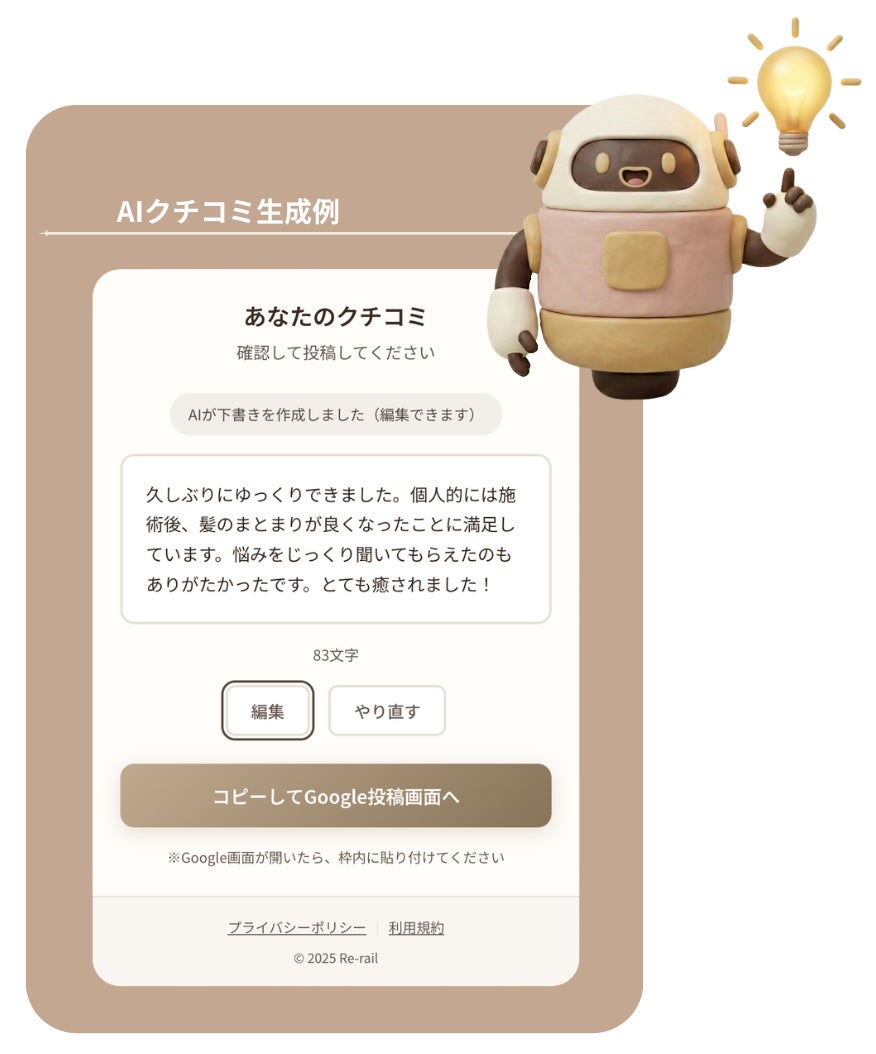 選択式が中心のため、お客様は文章を考えられないとしても問題なく生成可能。アプリのダウンロードも不要で、その場ですぐにご利用いただけます。生成されたクチコミ文は編集・再生成も可能で、納得のいく内容をお客様ご自身の意思で投稿していただく仕組みです。