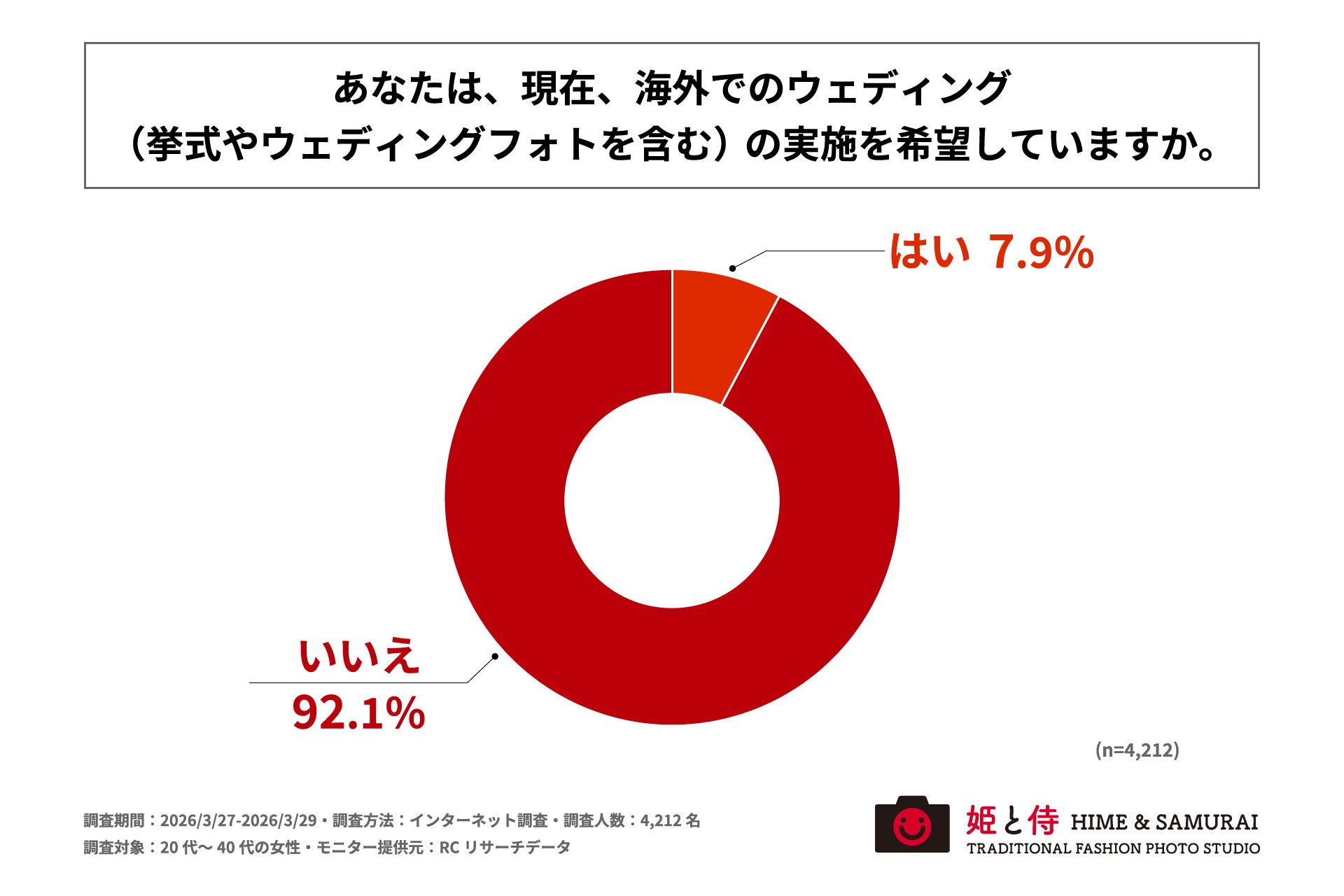 まず、「現在、海外でのウェディング(挙式やウェディングフォトを含む)の実施を希望しているか」を尋ねる設問への回答では、「いいえ」が92.1%、「はい」が7.9%という結果になりました。この結果から、20代~40代の女性の約1割が、現在、海外でのウェディングの実施を希望していることがわかりました。