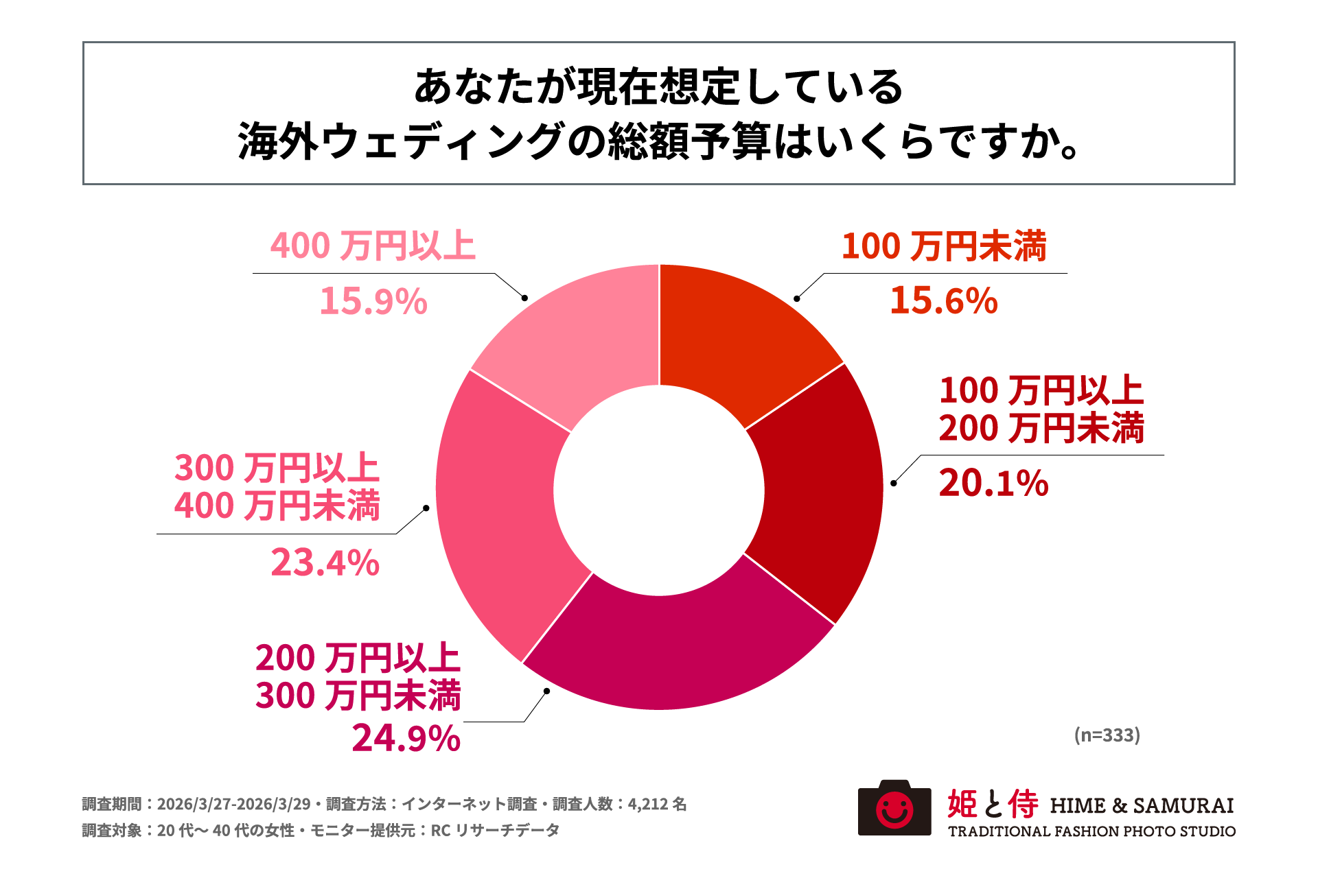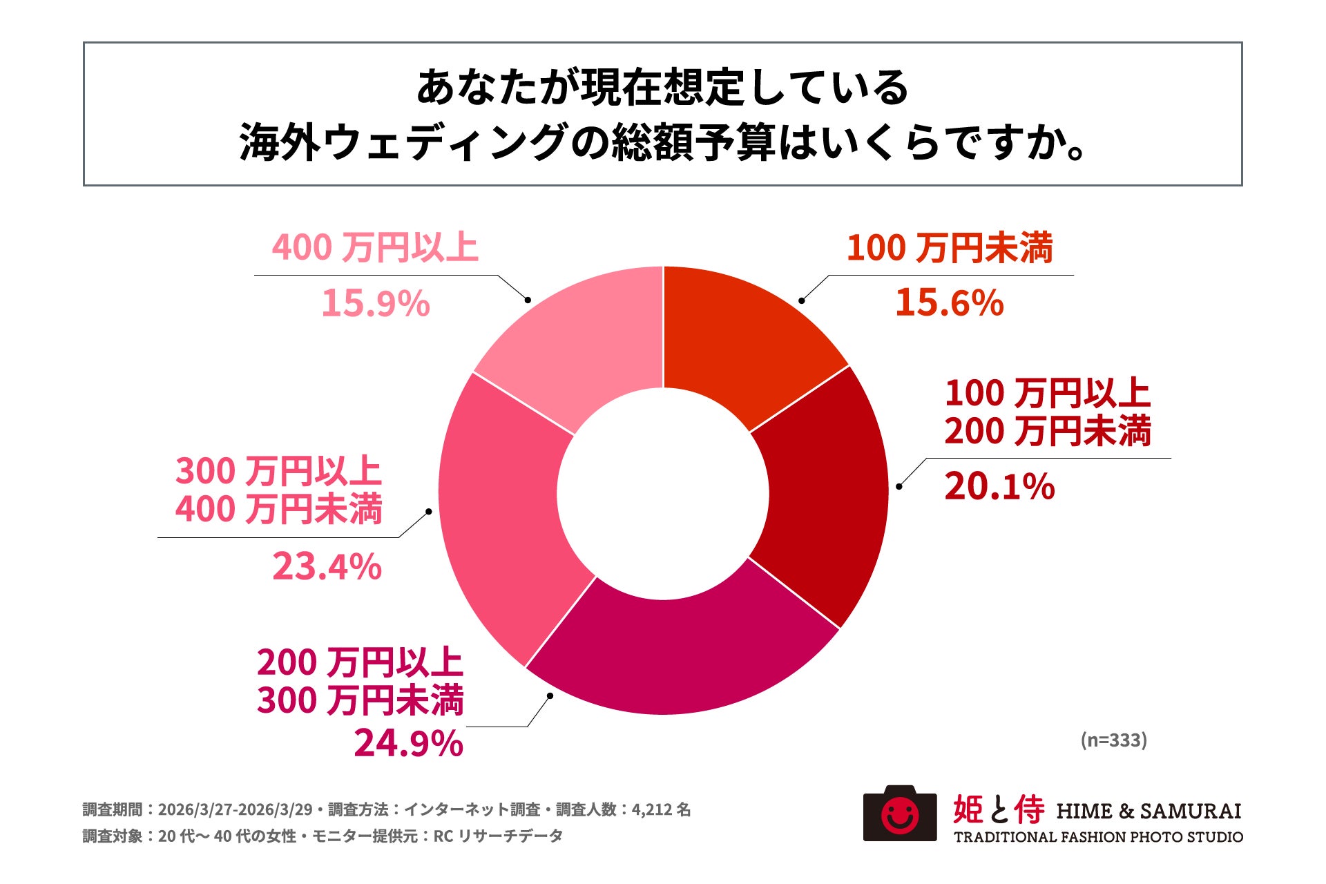 次に、海外ウェディングを希望する女性を対象に「現在想定している海外ウェディングの総額予算はいくらか」を尋ねる設問への回答では、1位が「200万円以上300万円未満」で24.9%、2位が「300万円以上400万円未満」で23.4%、3位が「100万円以上200万円未満」で20.1%という結果になりました。300万円未満の回答を合計すると60.6%となり、この結果から、海外ウェディングを希望する女性の約6割が、その総額予算を「300万円未満」と想定していることが判明しました。