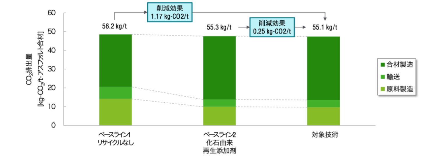 算定の結果、アスファルト再生用添加剤(SW-2)は、その製造工程において一定の CO₂排出を伴うため、再生添加剤単体の製造段階では、従来の化石資源由来品と CO₂排出量は同程度であることが確認されています。