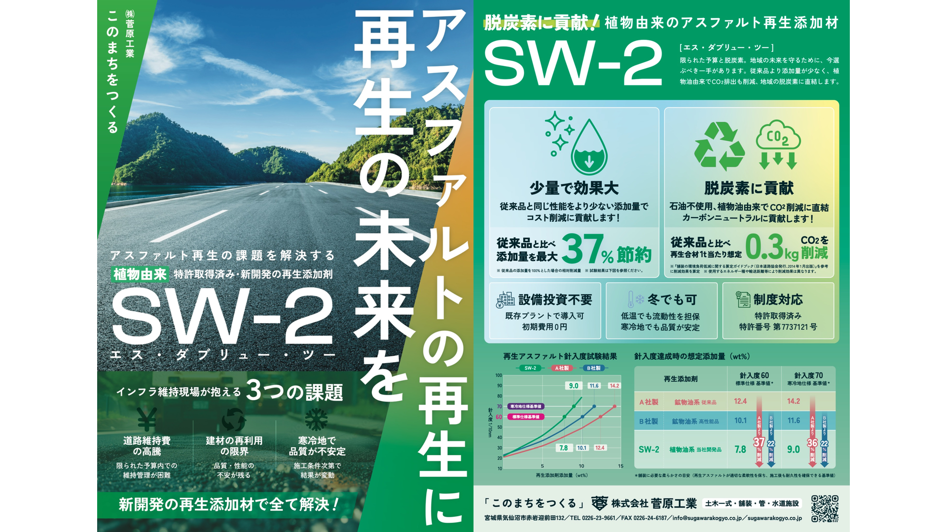 本取り組みでは、両者の共同出願により特許(第 7737121 号)を取得した再生添加剤「SW-2」を通じて、公共工事における「数値で説明できる脱炭素」の実現を目指します。