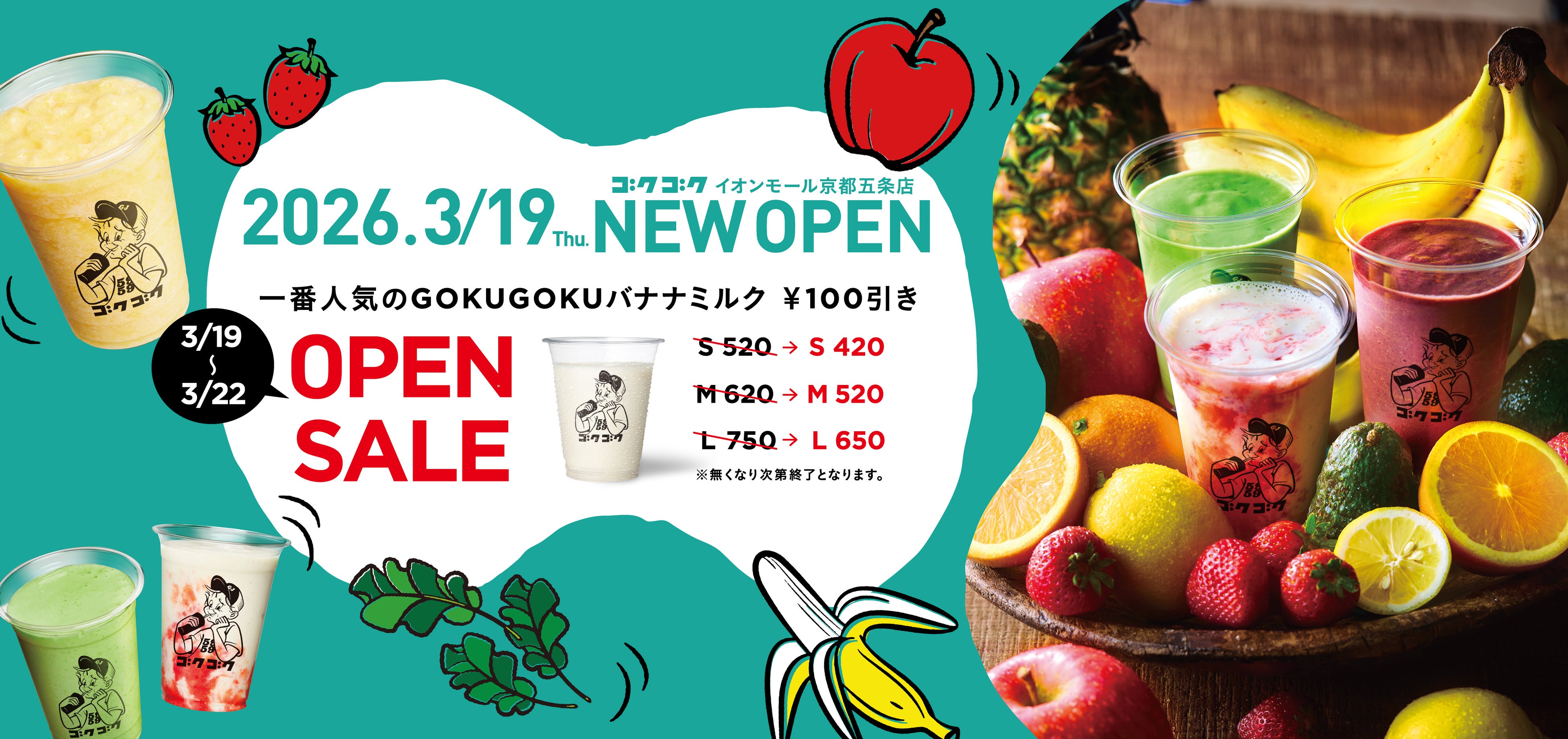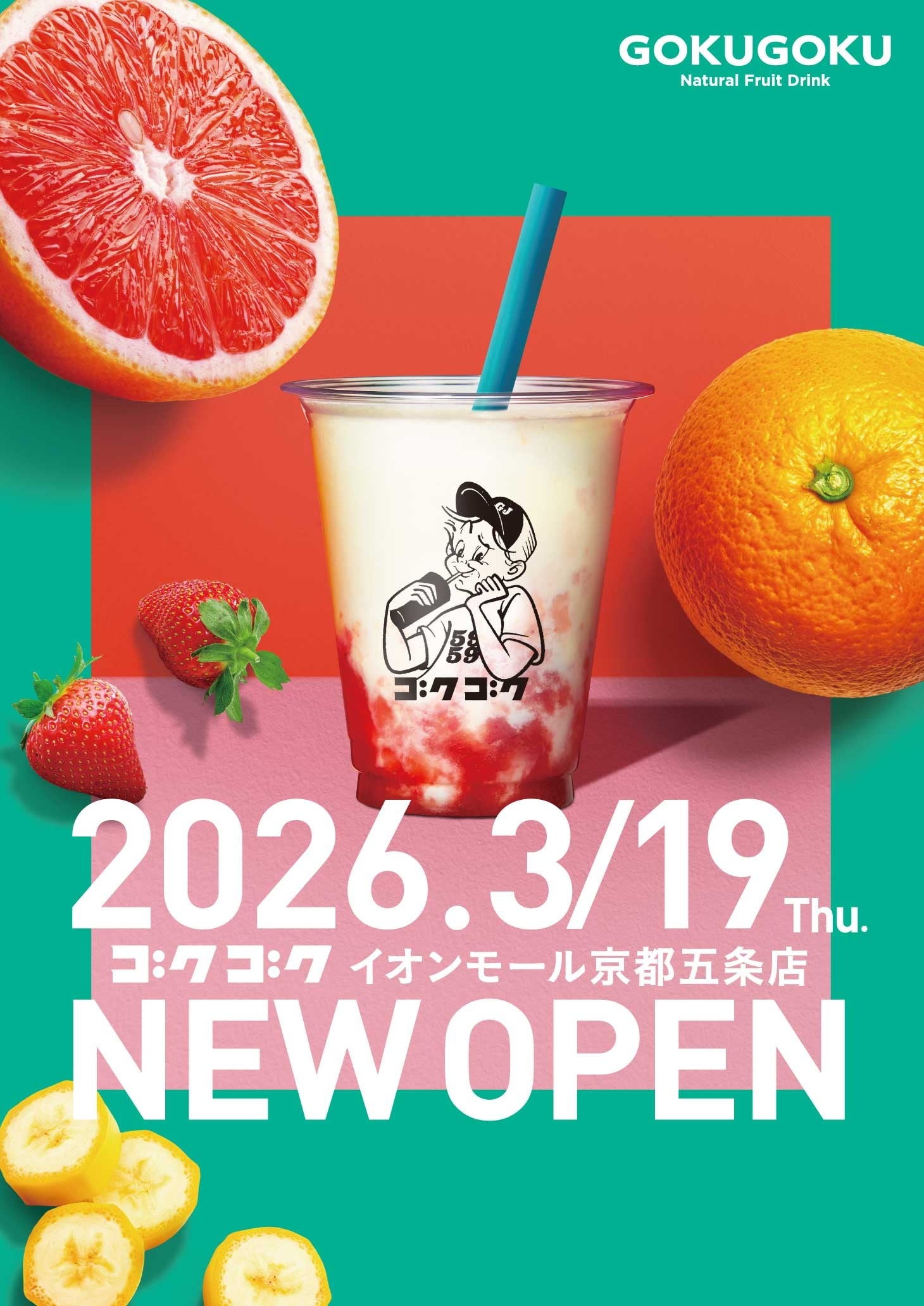 合同会社ライフコミュニケーション(本社:京都市右京区 代表:河 太龍)は、スムージー・フレッシュジュース専門店「GOKUGOKU(ゴクゴク)」の京都2号店となる「GOKUGOKU イオンモール京都五条店」を、2026年3月19日(木)にグランドオープンいたします。
