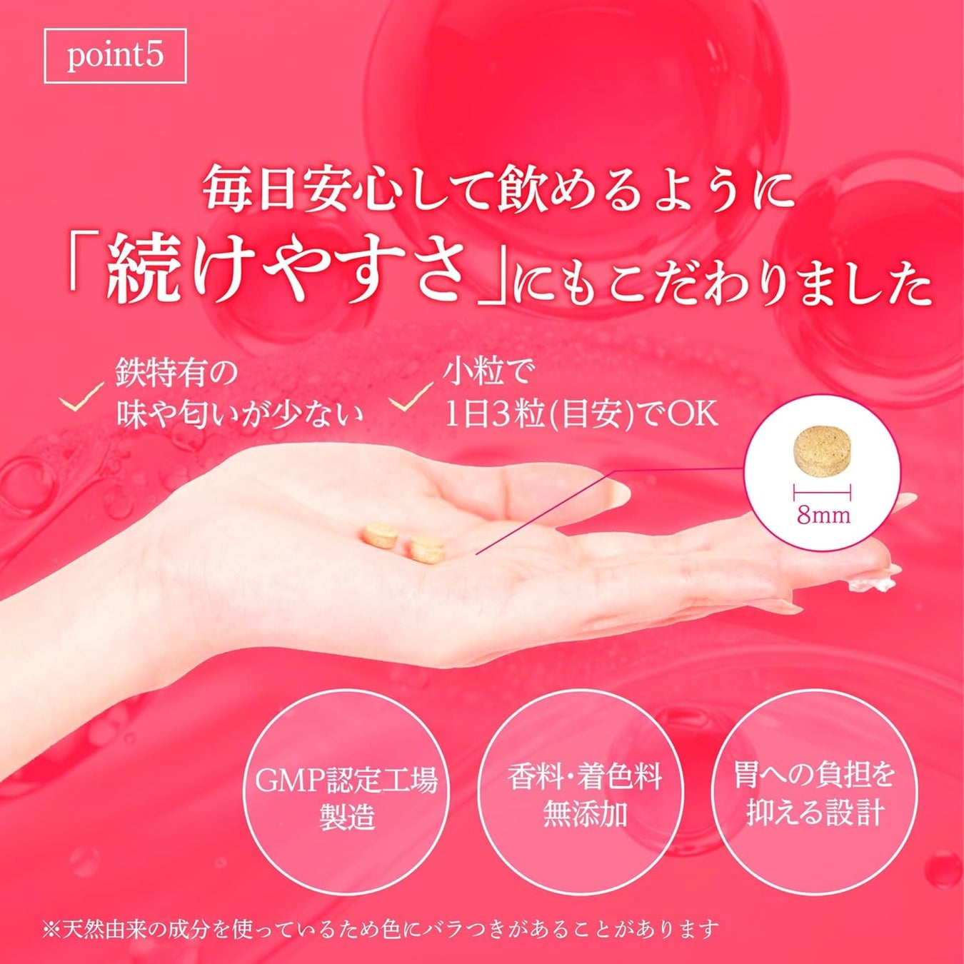 特殊なコーティング加工により、鉄を胃酸から守りながら腸まで届けるリポソーム化技術を採用。一般的な非ヘム鉄(※)と比べて約2.5倍の吸収率を実現し、鉄特有の味やにおい、胃への負担を大幅に軽減しています。