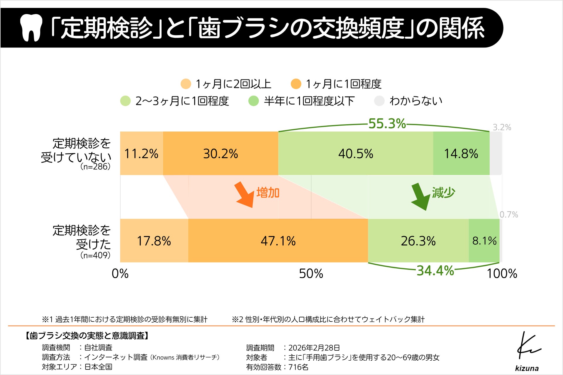 そこで、患者さまとの対話を重視し、予防歯科から審美治療まで幅広い歯科医療を提供する『医療法人きずな きずな歯科クリニック』( https://www.kizna-dc.com/ )(所在地:兵庫県神戸市北区、院長:水野貴文)は、生活者の歯ブラシ交換の実態を明らかにするため、全国の20~69歳の男女716名を対象に調査を実施しました。