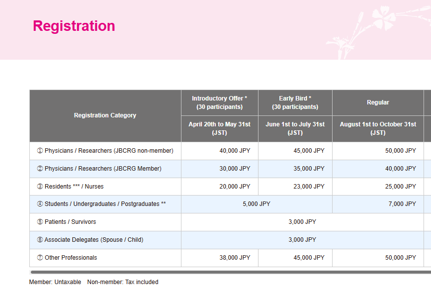 参加登録は公式サイト内の登録ページより受け付けます。また、JBCRG会員には特別割引が適用されます。