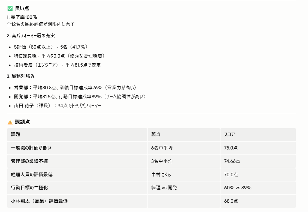 全体結果と詳細分析(職種・職位・評価者)、分析に対するコメントを提示 |