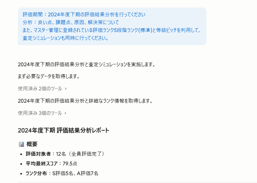 「誰がまだ入力していないか」「今期の評価傾向は」——チャット一言で、評価業務のすべてが動く。