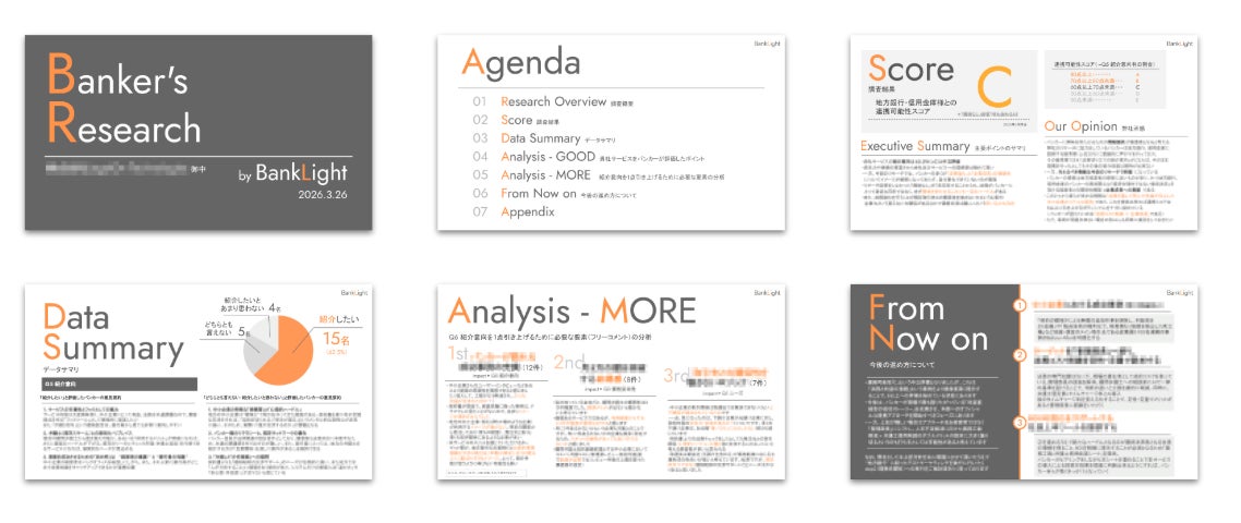 2026年4月27日、株式会社バンクライト(本社:大阪市中央区、代表取締役:笹島敦史)は、地域金融機関とのアライアンス体制を構築したい事業会社について、現場のバンカー(※1)によるリアルな声を収集・分析し、締結後の連携の可能性を可視化するリサーチサービス「Bankers Research(バンカーズリサーチ)」を本日正式にリリースいたします。